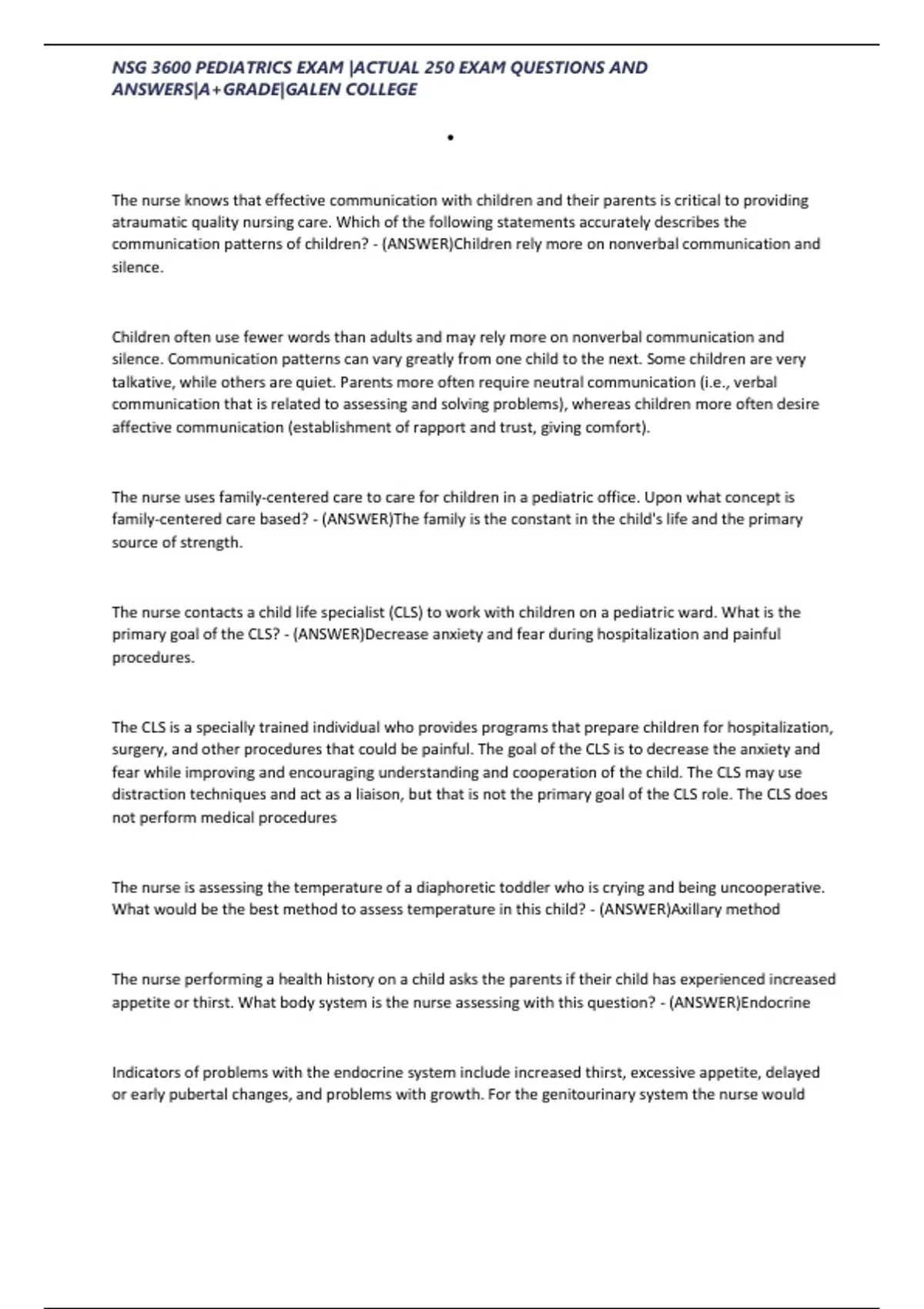 NSG 3600 PEDIATRICS EXAM |ACTUAL 250 EXAM QUESTIONS AND