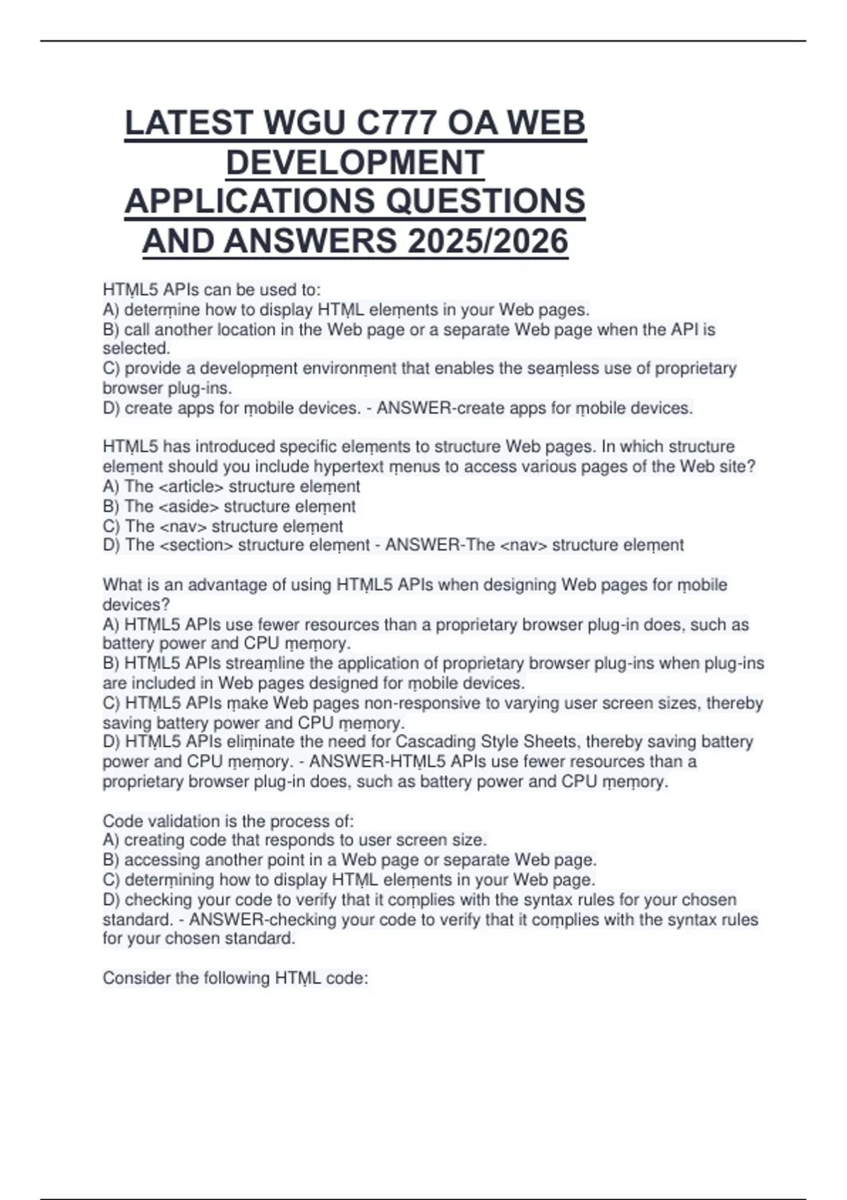 This document contains the latest questions and answers for the WGU C777 OA Web Development Applications exam for 2025/2026. It is designed to reflect the current exam structure and core topics, helping students practice effectively. With accurate and updated content, it serves as a reliable study resource for exam preparation.