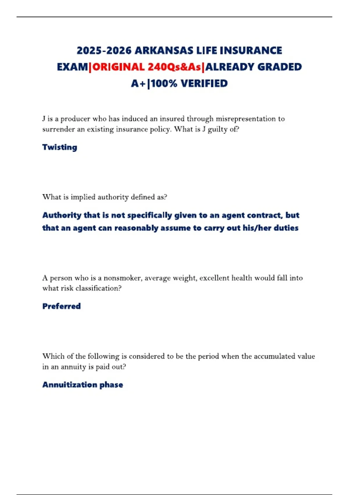 ARKANSAS LIFE INSURANCE EXAM|ORIGINAL 240Qs&As|ALREADY GRADED A+|100% VERIFIED