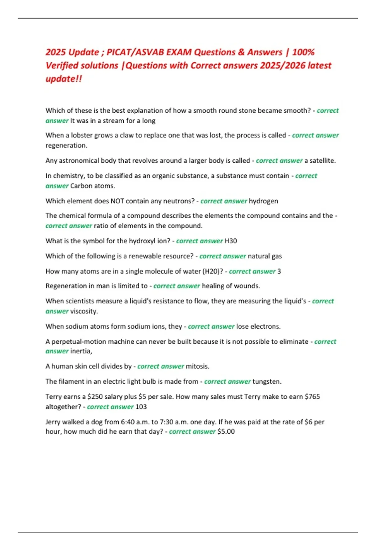 2025 Update ; PICAT/ASVAB EXAM Questions & Answers | 100% Verified solutions |Questions with Correct answers 2025/2026 latest update!!
