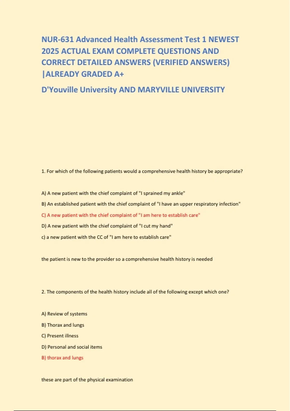 NUR-631 Advanced Health Assessment Test 1 NEWEST 2025 ACTUAL EXAM COMPLETE QUESTIONS AND CORRECT DETAILED ANSWERS (VERIFIED ANSWERS) |ALREADY GRADED A+ D'Youville University