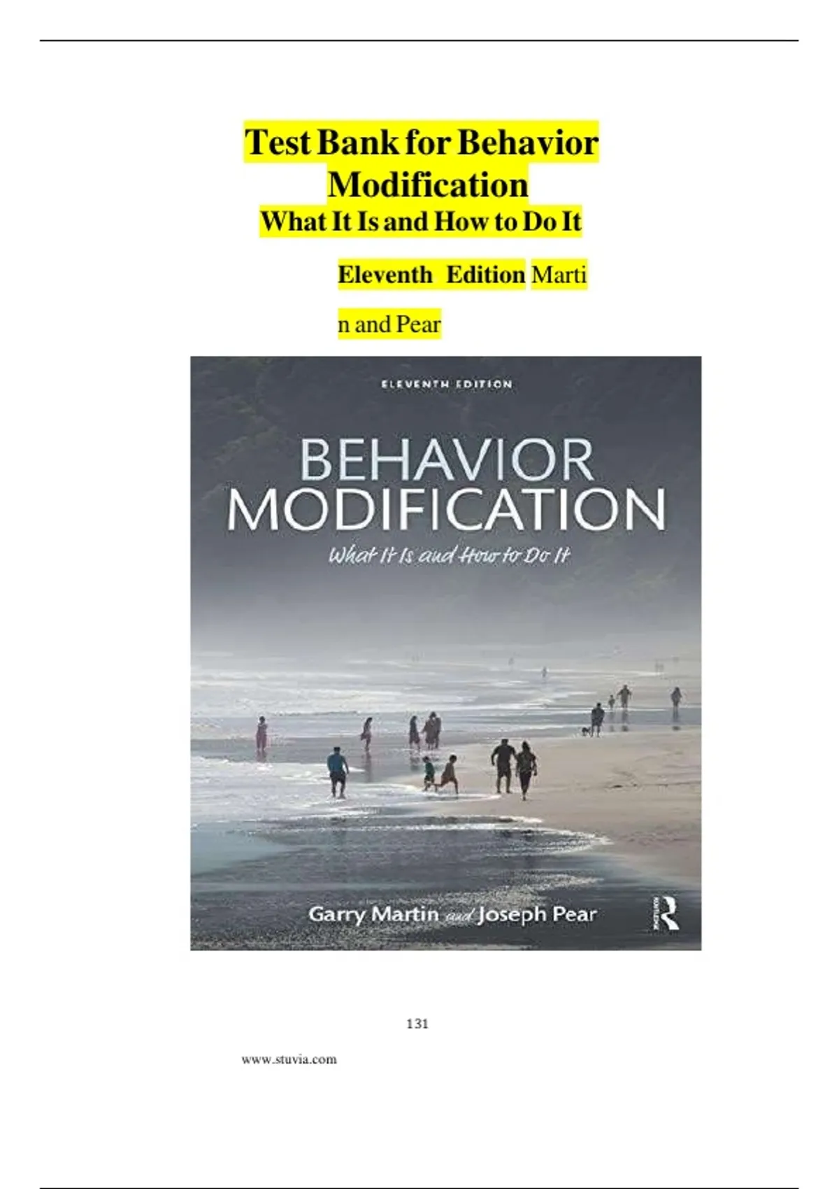 This document contains the full test bank for Behavior Modification: What It Is and How to Do It, 11th Edition by Garry Martin and Joseph Pear. It provides multiple-choice, true/false, and applied questions with answers for all chapters. Covered topics include the principles of behavior modification, reinforcement, punishment, extinction, shaping, stimulus control, self-management, token economies, behavioral assessment, and ethical considerations. The material is designed to support exam preparation and strengthen understanding of applied behavior analysis and modification techniques.