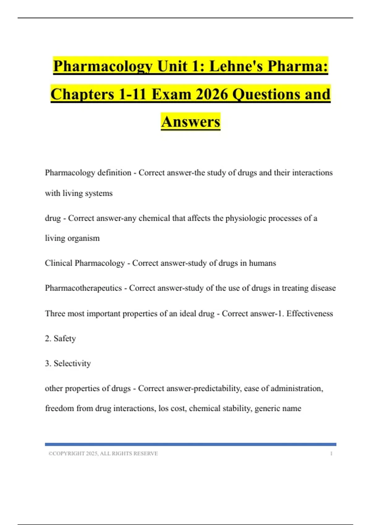 Pharmacology Unit 1: Lehne's Pharma: Chapters 1-11 Exam 2026 Questions and Answers