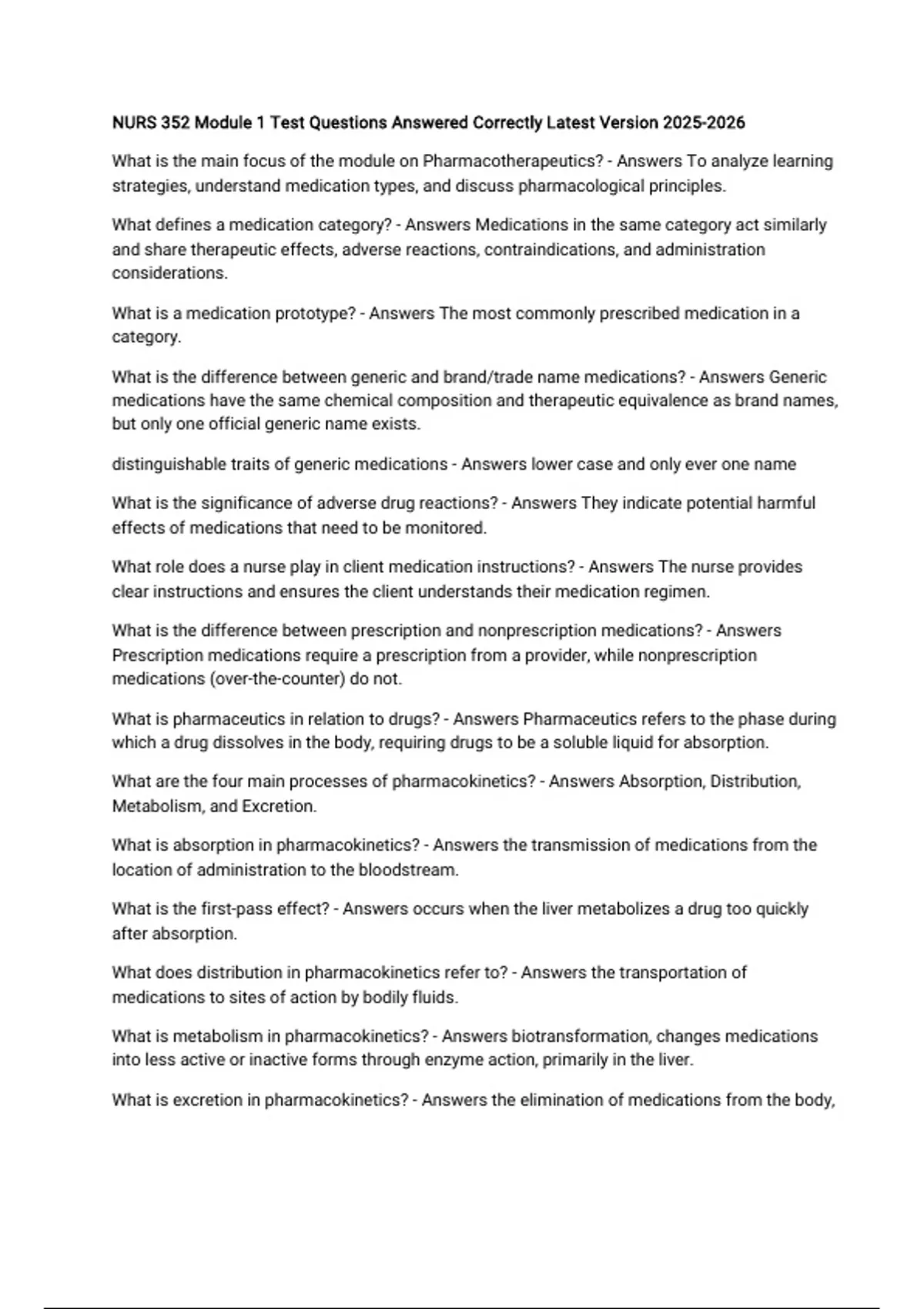 NURS 352 Module 1 Test Questions Answered Correctly Latest Version What is the main focus of the module on Pharmacotherapeutics? - Answers To analyze learning strategies, understand medication types, and discuss pharmacological principles. What defines a medication category? - Answers Medications in the same category act similarly and share therapeutic effects, adverse reactions, contraindications, and administration considerations. What is a medication prototype? - Answers The most commonly prescribed medication in a category. What is the difference between generic and brand/trade name medications? - Answers Generic medications have the same chemical composition and therapeutic equivalence as brand names, but only one official generic name exists. distinguishable traits of generic medications - Answers lower case and only ever one name What is the significance of adverse drug reactions? - Answers They indicate potential harmful effects of medications that need to be monitored. What role does a nurse play in client medication instructions? - Answers The nurse provides clear instructions and ensures the client understands their medication regimen. What is the difference between prescription and nonprescription medications? - Answers Prescription medications require a prescription from a provider, while nonprescription medications (over-the-counter) do not. What is pharmaceutics in relation to drugs? - Answers Pharmaceutics refers to the phase during which a drug dissolves in the body, requiring drugs to be a soluble liquid for absorption. What are the four main processes of pharmacokinetics? - Answers Absorption, Distribution, Metabolism, and Excretion. What is absorption in pharmacokinetics? - Answers the transmission of medications from the location of administration to the bloodstream. What is the first-pass effect? - Answers occurs when the liver metabolizes a drug too quickly after absorption. What does distribution in pharmacokinetics refer to? - Answers the transportation of medications to sites of action by bodily fluids. What is metabolism in pharmacokinetics? - Answers biotransformation, changes medications into less active or inactive forms through enzyme action, primarily in the liver. What is excretion in pharmacokinetics? - Answers the elimination of medications from the body, primarily through the kidneys. What is the significance of a high therapeutic index? - Answers indicates a wide safety margin, meaning routine blood medication-level monitoring is not necessary. What does a low therapeutic index indicate? - Answers indicates a narrow safety margin, requiring close monitoring of medication levels. What are peak levels in medication responses? - Answers the highest plasma level of a medication What are trough levels in medication responses? - Answers the lowest plasma level What is half-life in pharmacology? - Answers the time it takes for the medication in the body to drop by 50%. How many half-lives does it typically take to achieve a steady blood concentration? - Answers It usually takes four half-lives to achieve a steady blood concentration. What is the short half-life medications? - Answers leave the body quickly (4-8 hours) What is the long half-life medications? - Answers leave slowly (>24 hours), posing a greater risk for accumulation and toxicity. How much of a drug with a half-life of 24 hours remains after 72 hours if the initial dose is 1000 mg? - Answers After 72 hours, 125 mg of the drug will remain in the body. What is pharmacodynamics? - Answers the biochemical changes that occur in the body as a result of taking a medication.