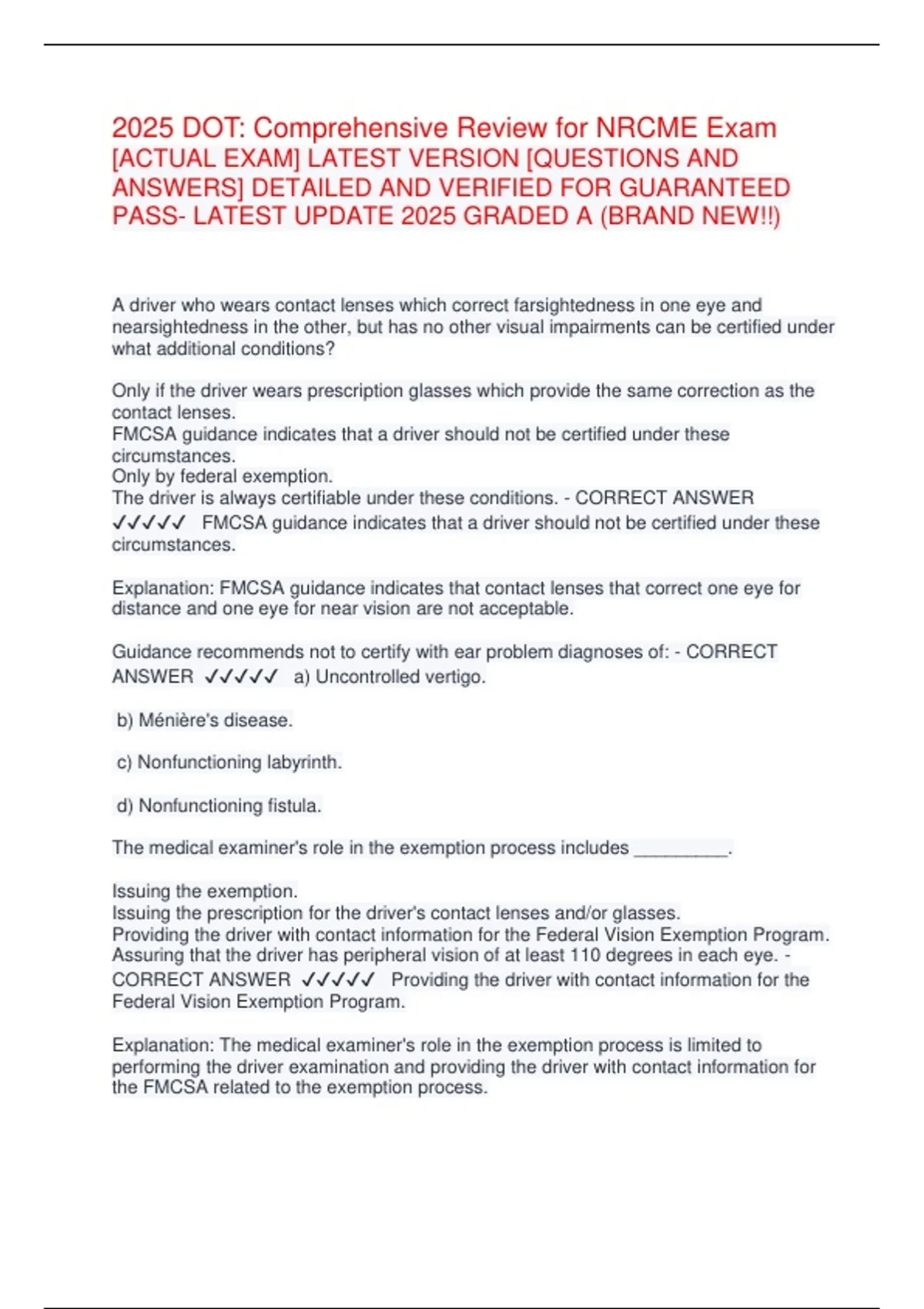 ✔✔✔✔✔ FMCSA guidance indicates that a driver should not be certified under these