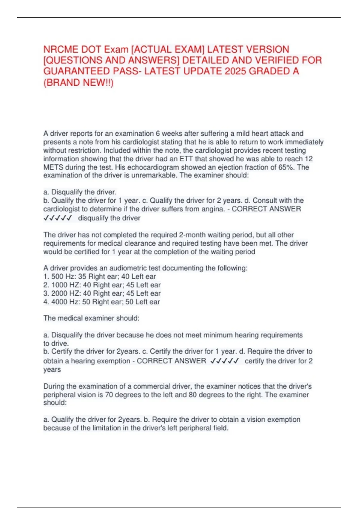 NRCME DOT Exam -ACTUAL EXAM- LATEST VERSION -QUESTIONS AND ANSWERS NRCME DOT Exam -ACTUAL EXAM- LATEST VERSION -QUESTIONS AND ANSWERS