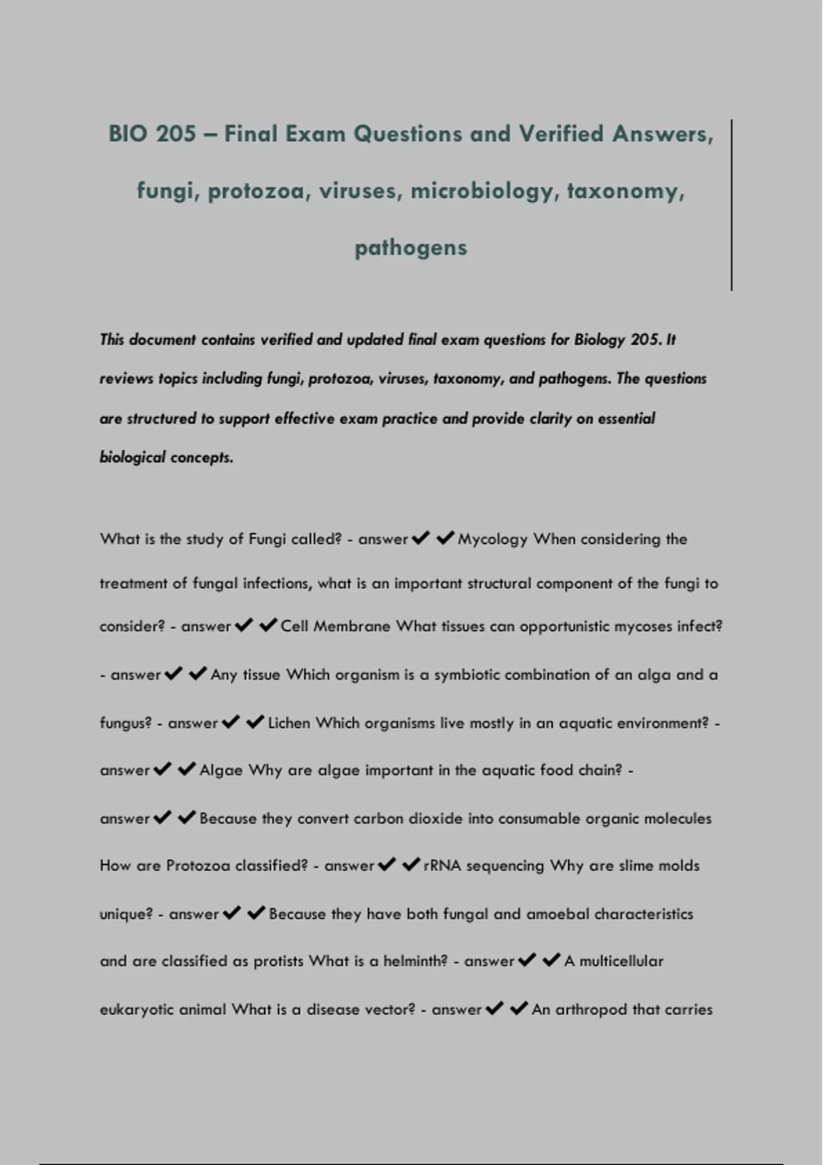 This document contains verified and updated final exam questions for Biology 205. It reviews topics including fungi, protozoa, viruses, taxonomy, and pathogens. The questions are structured to support effective exam practice and provide clarity on essential biological concepts. What is the study of Fungi called? - answerMycology When considering the treatment of fungal infections, what is an important structural component of the fungi to consider? - answerCell Membrane What tissues can opportunistic mycoses infect? - answerAny tissue Which organism is a symbiotic combination of an alga and a fungus? - answerLichen Which organisms live mostly in an aquatic environment? - answerAlgae Why are algae important in the aquatic food chain? - answerBecause they convert carbon dioxide into consumable organic molecules How are Protozoa classified? - answerrRNA sequencing Why are slime molds unique? - answerBecause they have both fungal and amoebal characteristics and are classified as protists What is a helminth? - answerA multicellular eukaryotic animal What is a disease vector? - answerAn arthropod that carries - 2 -: a disease Where does a virus multiply? - answerIn the host cell Which microscope is used to view a virus in detail (typically)? - answerScanning electron microscope What kind of DNA or RNA do viruses contain? - answerAny of the above Which of the following is mismatched? - answerEnveloped helical virus - Herpesvirus How are viruses classified? - answerAll of the above What is the area of lysis called on a bacteria lawn? - answerPlaque The cultivation of some animal viruses (e.g., Simian AIDS) typically requires what? - answerA live