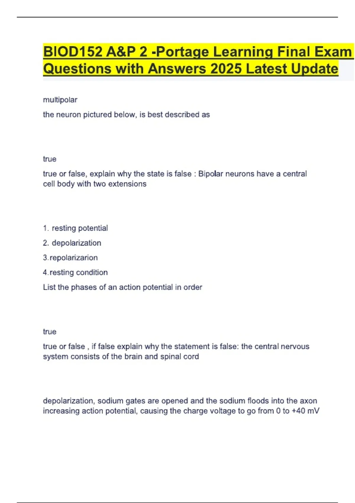 BIOD152 A&P 2 -Portage Learning Final Exam Questions with Answers 2025 Latest Update