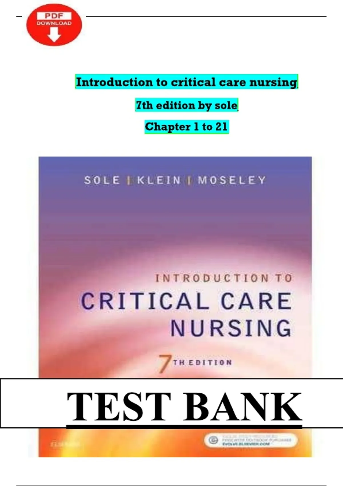 Download the complete Test Bank for Introduction to Critical Care Nursing, 7th Edition by Mary Lou Sole. This resource provides a full set of exam-style questions and verified answers to help nursing students and instructors master critical care nursing concepts and prepare for success. Covers all chapters from the 7th Edition Verified questions with accurate answers Focused on key critical care nursing principles Ideal for study, revision, and exam preparation Trusted by nursing students and educators