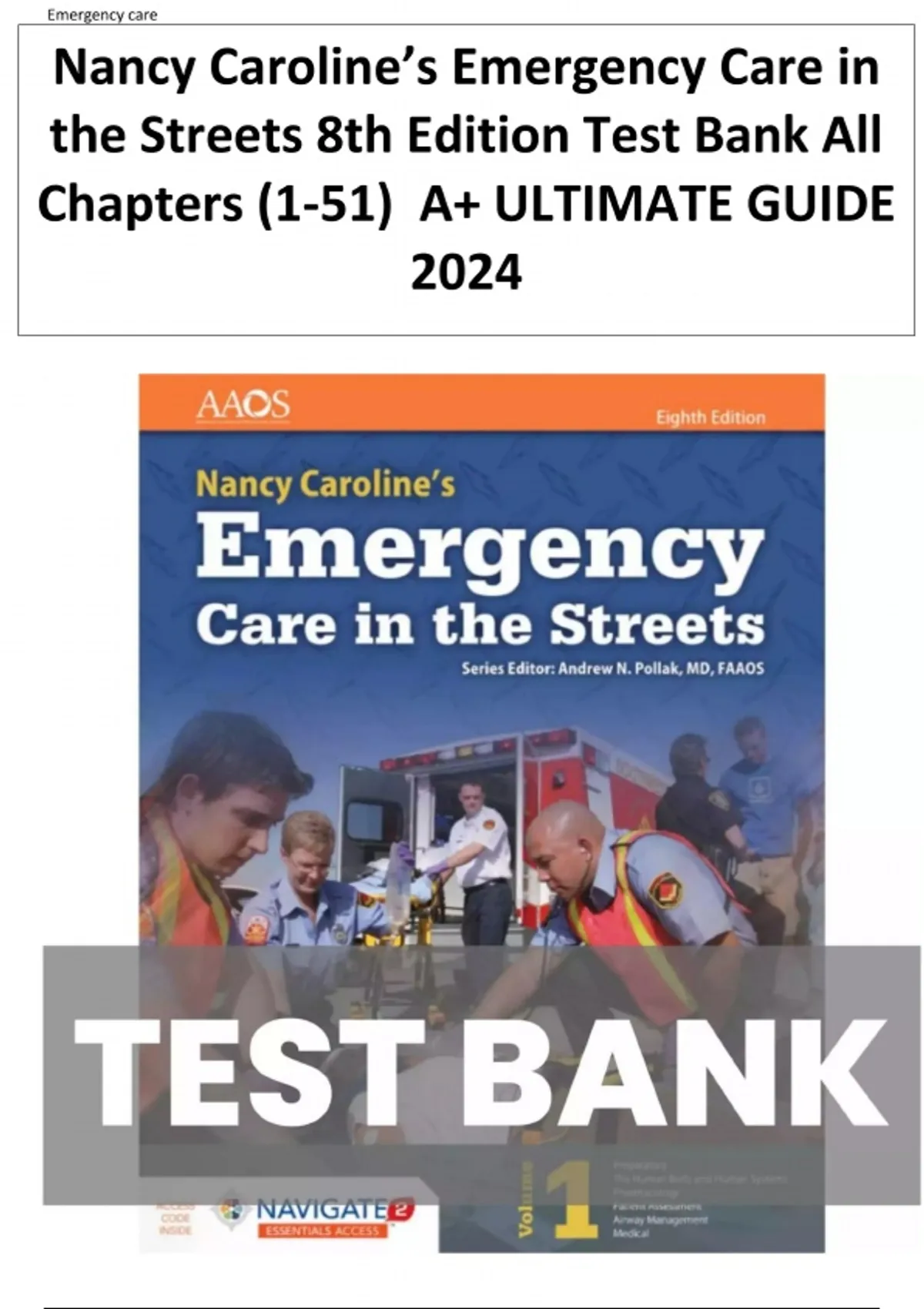 test bank for Nancy Caroline’s Emergency Care in the Streets (8th Edition). Includes chapter-by-chapter multiple-choice questions and correct answers — perfect for paramedic students, EMS training programs, and NREMT exam preparation.