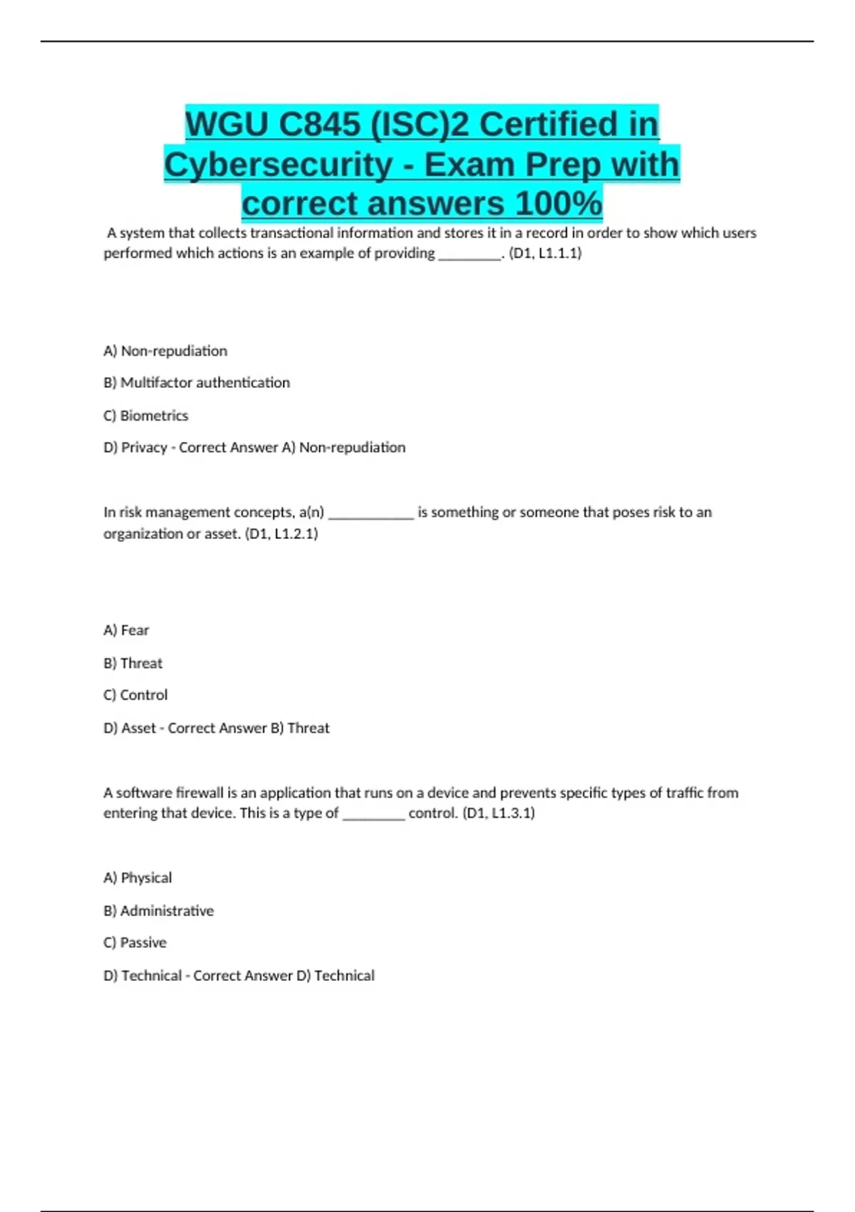 D) Privacy - Correct Answer A) Non-repudiation