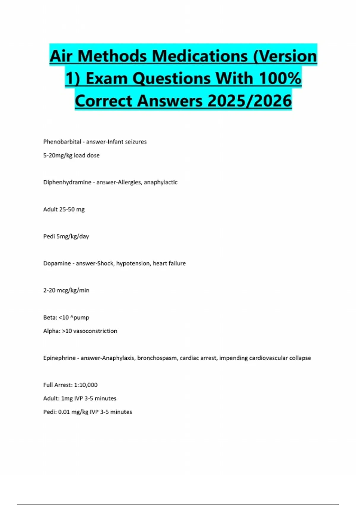 Air Methods Medications (Version 1) Exam Questions With 100% Correct Answers 2025/2026 Phenobarbital - answer-Infant seizures 5-20mg/kg load dose Diphenhydramine - answer-Allergies, anaphylactic Adult 25-50 mg Pedi 5mg/kg/day Dopamine - answer-Shock, hypotension, heart failure 2-20 mcg/kg/min Beta: 10 ^pump Alpha: 10 vasoconstriction Epinephrine - answer-Anaphylaxis, bronchospasm, cardiac arrest, impending cardiovascular collapse Full Arrest: 1:10,000 Adult: 1mg IVP 3-5 minutes Pedi: 0.01 mg/kg IVP 3-5 minutes
