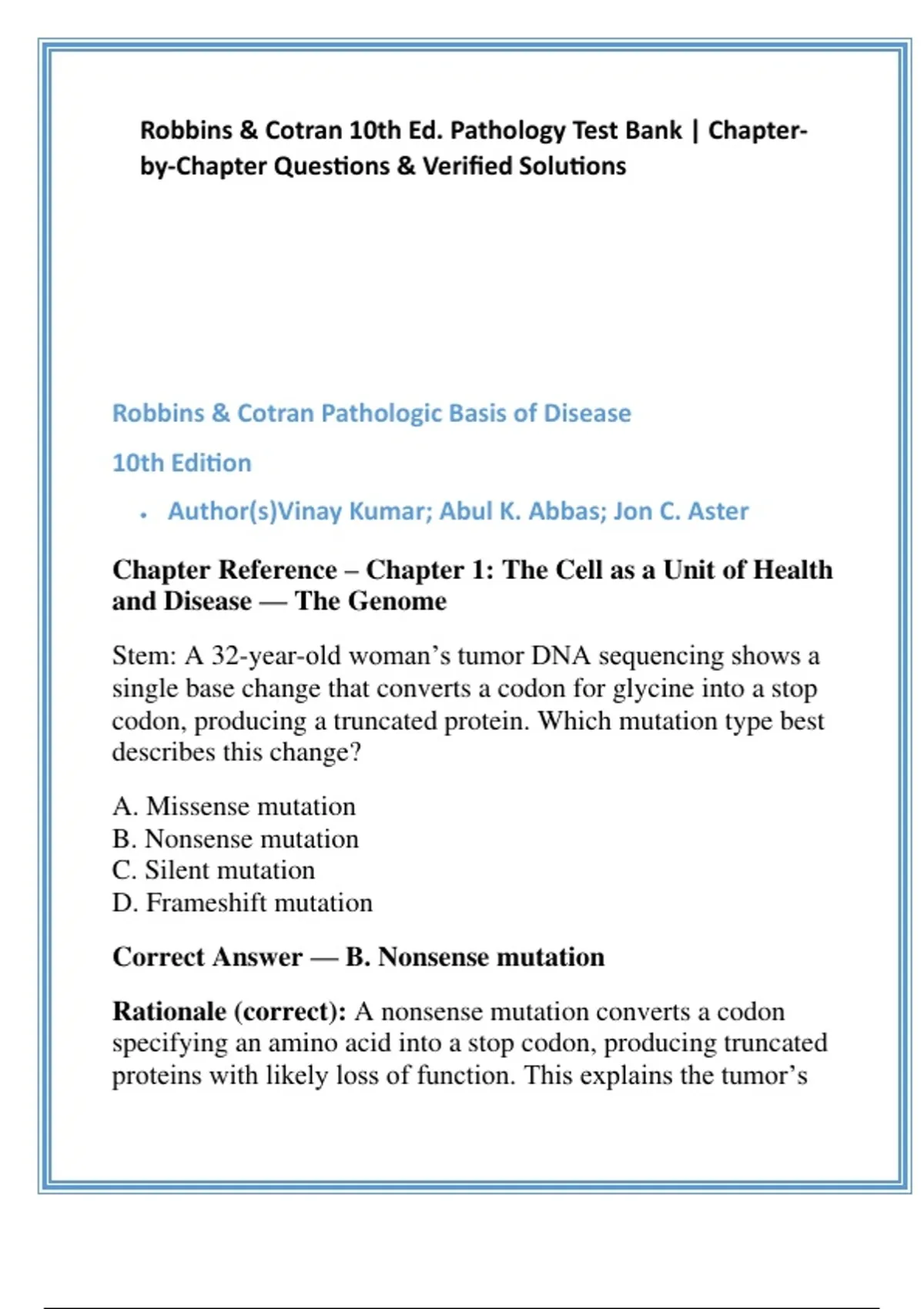 Rationale (correct): A nonsense mutation converts a codon
