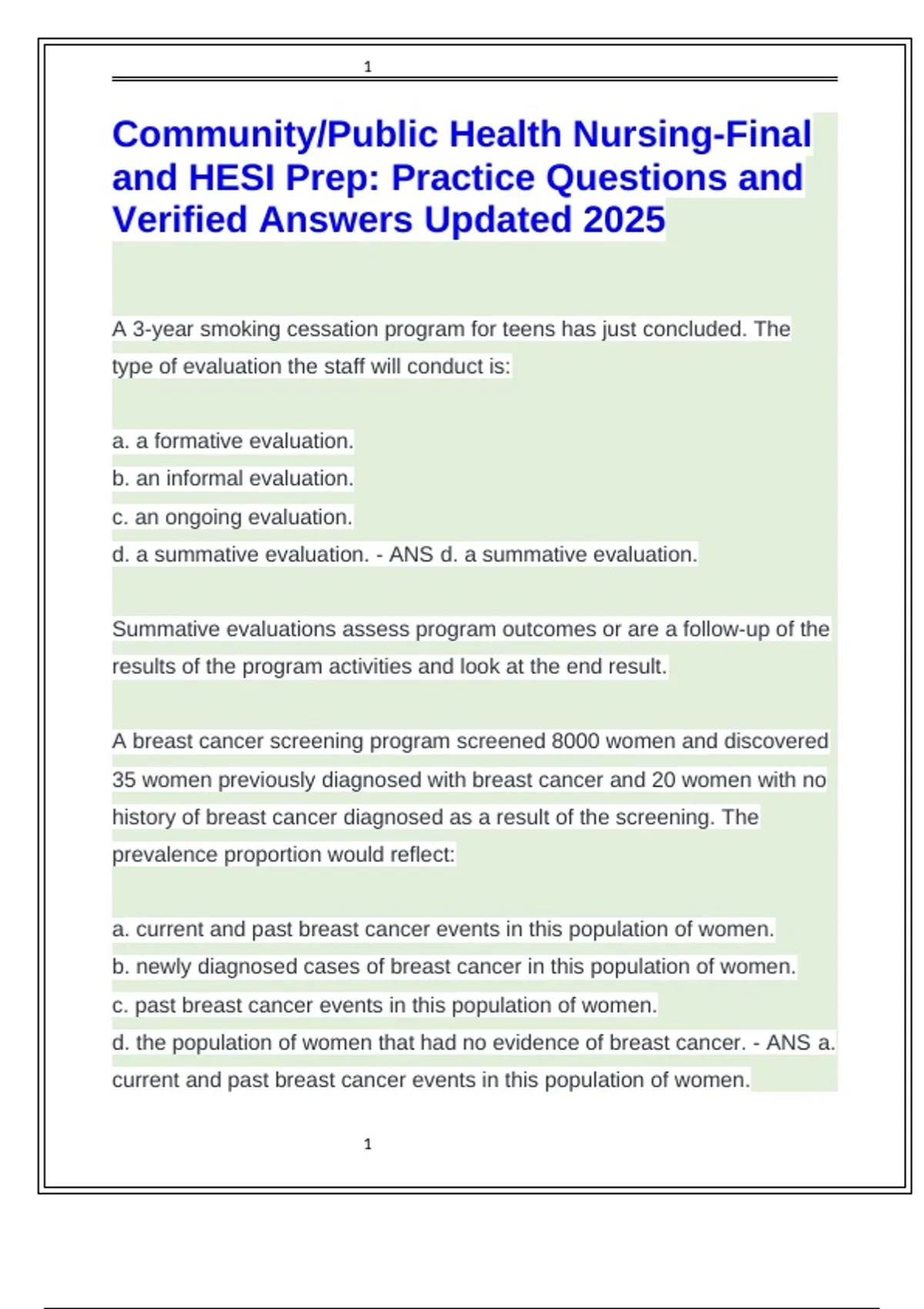 Community and Public Health Nursing-Final and HESI Prep Practice Questions and Verified Answers