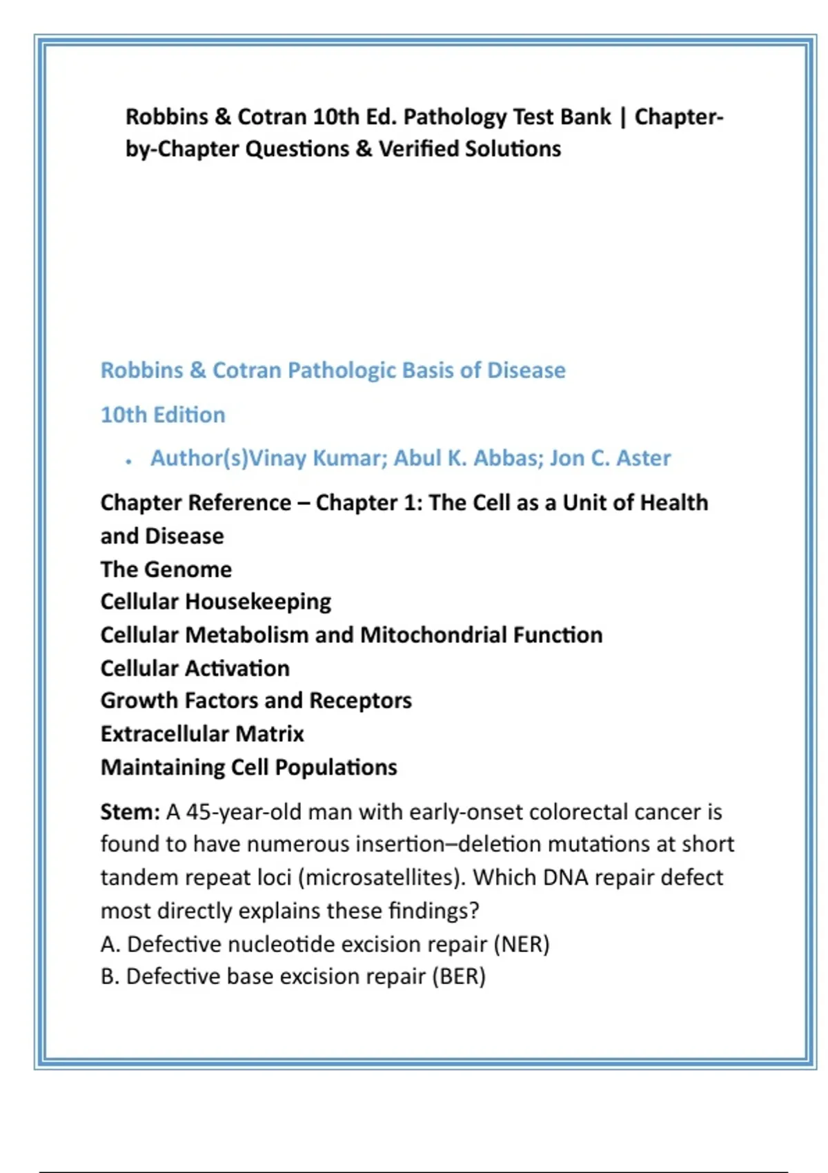 Robbins & Cotran 10th Ed. — Complete Chapter-by-Chapter Test Bank: Verified Answers & Evidence-Based Rationales Mastering Robbins Pathology (10th Ed.) — Comprehensive Chapterwise Q-Bank for Board & Certification Prep High-converting Stuvia product description (ready to paste) Product title: Robbins & Cotran 10th Ed. — Complete Chapter-by-Chapter Test Bank: Verified Answers & Evidence-Based Rationales Short subtitle: 2,500+ exam-style questions mapped to every Robbins chapter — clinical vignettes, verified answers, and concise pathophysiology rationales. Long description (marketing + features): Prepare faster and smarter with the most comprehensive Robbins & Cotran (10th edition) chapter-by-chapter test bank available on Stuvia. Designed by expert item-writers in pathology and medical education, this Q-bank delivers realistic, exam-style multiple-choice questions and clinical vignettes mapped directly to each Robbins chapter. Every question includes a verified correct answer and a succinct, evidence-based rationale tied to Robbins’ core mechanisms — perfect for medical students, residents, and clinicians preparing for board and licensing exams. What you get: Complete chapter mapping: Questions aligned to every Robbins chapter for focused, efficient study. Verified correct answers + rationales: Clear, mechanism-based explanations that cite core Robbins concepts to reinforce understanding. Exam-style vignettes: Clinical stems that mimic USMLE/PLAB/other board formats to build application skills. Multiple item formats: Single-best-answer MCQs, clinical reasoning items, and item writers’ tips for distractor design. Study aids included: Chapter quizzes, cumulative practice tests, answer key CSV, and printable PDF. Certification-aligned focus: Questions emphasize high-yield concepts commonly tested on board and licensure exams. Flexible use: Self-study, group review, classroom use, and instructor test construction. Why learners love it: Questions are written by pathology educators with Robbins expertise — concise rationales make every item a mini-lesson so you learn while you test. Designed to maximize exam readiness and retention, not just rote memorization. Important note: This resource is an evidence-based study aid intended to strengthen knowledge and exam technique. While it is designed to significantly improve preparedness, no study material can absolutely guarantee certification outcomes. #RobbinsPathology #PathologyQBank #Robbins10thEd #MedicalExamPrep #USMLEPrep #BoardExamQuestions #PathologyMCQs #ClinicalVignettes #MedicalStudents #ExamReady 8 SEO keywords (high relevance) Robbins & Cotran 10th edition test bank pathology MCQs with rationale chapter by chapter Robbins questions pathology question bank for boards Robbins pathology Q-bank PDF USMLE pathology practice questions evidence-based pathology exam prep comprehensive pathology Qbank