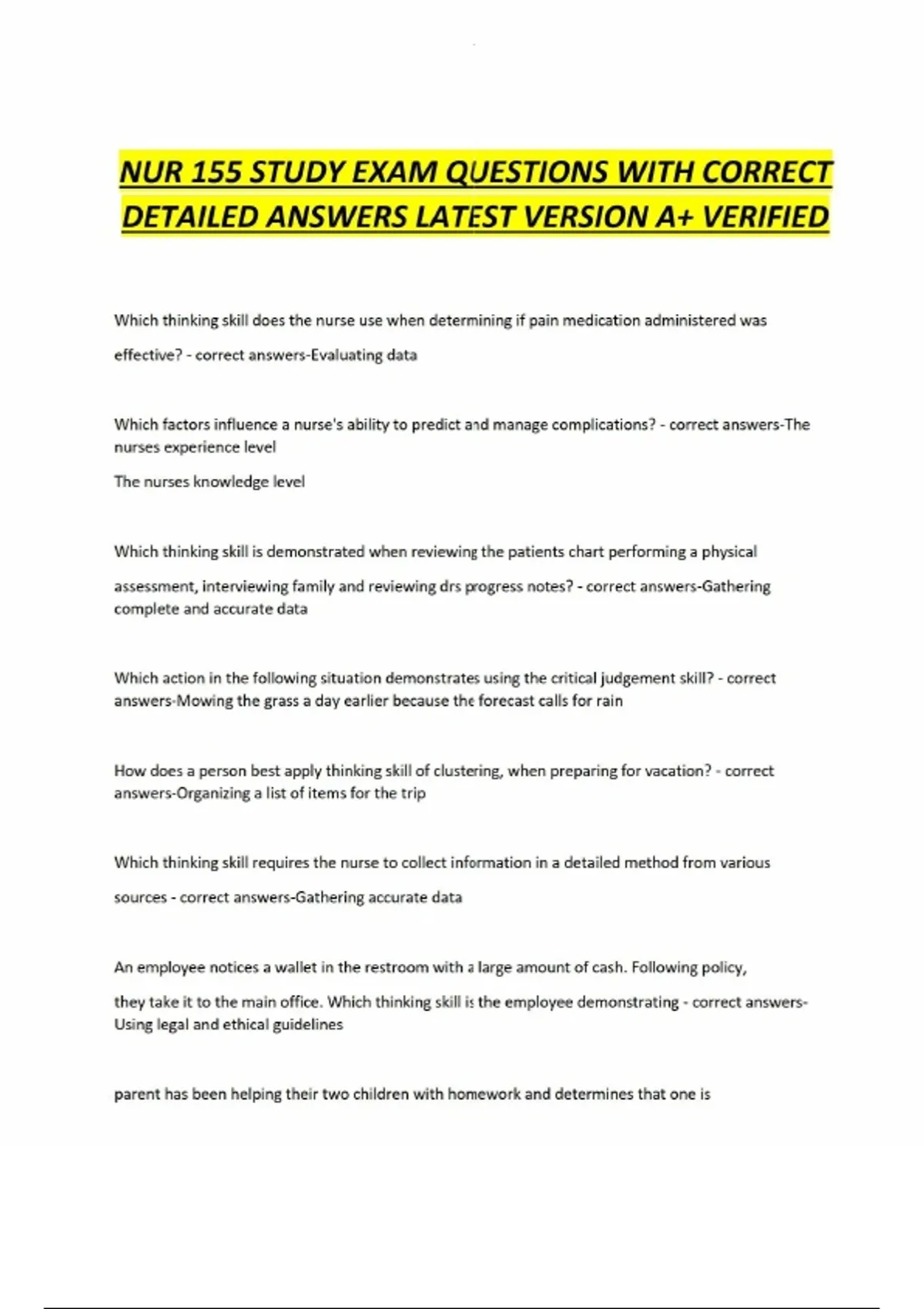 NUR 155 STUDY EXAM QUESTIONS WITH CORRECT DETAILED ANSWERS LATEST VERSION A+ VERIFIED NUR 155 STUDY EXAM QUESTIONS WITH CORRECT DETAILED ANSWERS LATEST VERSION A+ VERIFIED