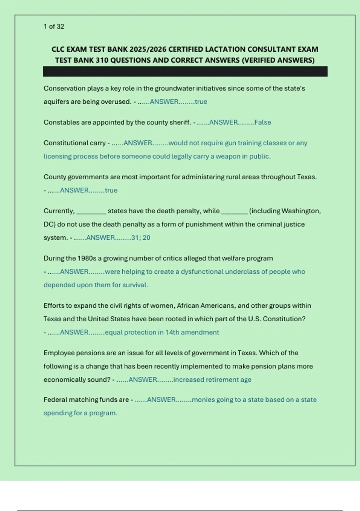 CLC EXAM TEST BANK 2025/2026 CERTIFIED LACTATION CONSULTANT EXAM