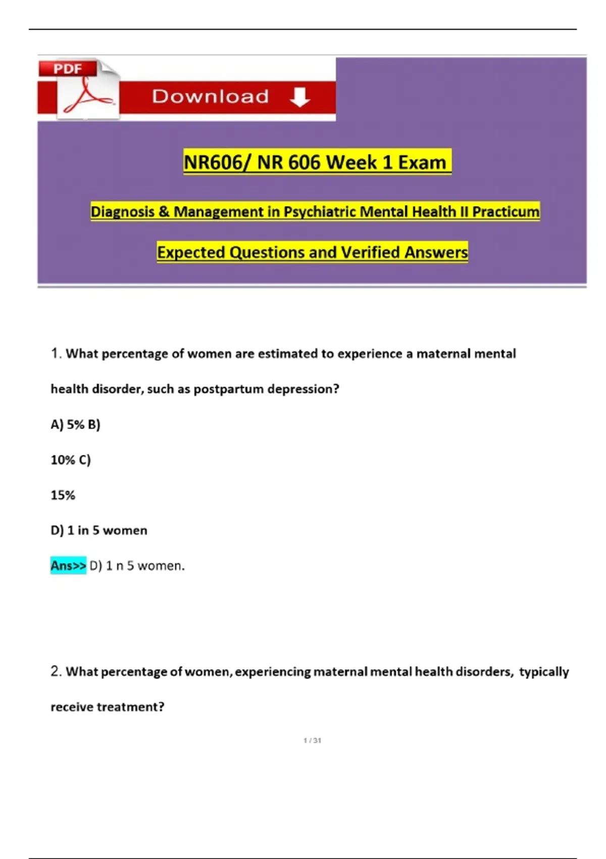 NR606 Week 1 Exam Guide: Maternal & Pediatric Mental Health Questions & Answers