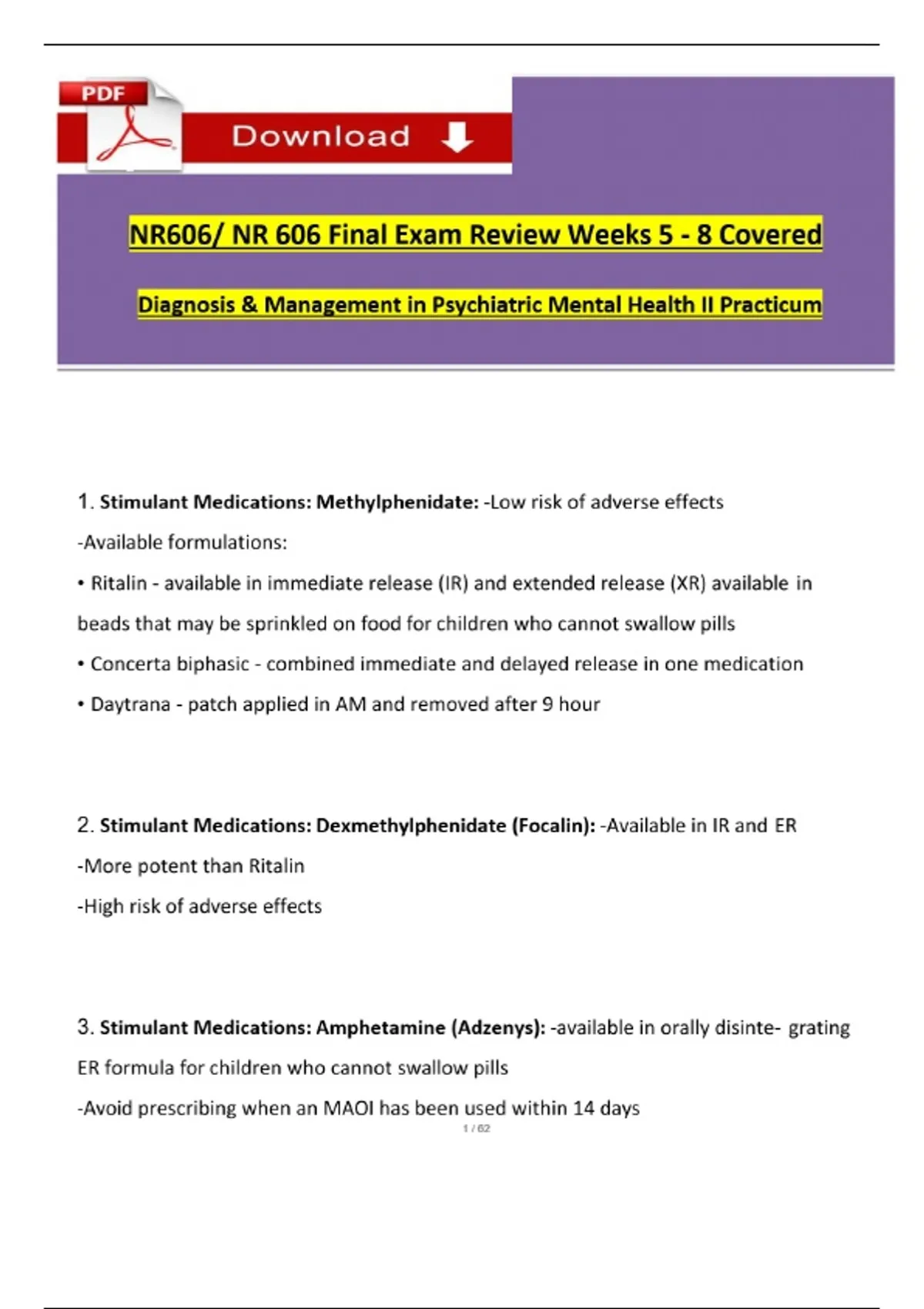 Comprehensive NR606 Final Exam review covering ADHD treatments, pediatric eating disorders, trauma-informed care, substance use in adolescents, and DSM-5-TR criteria. Essential for PMHNP students.