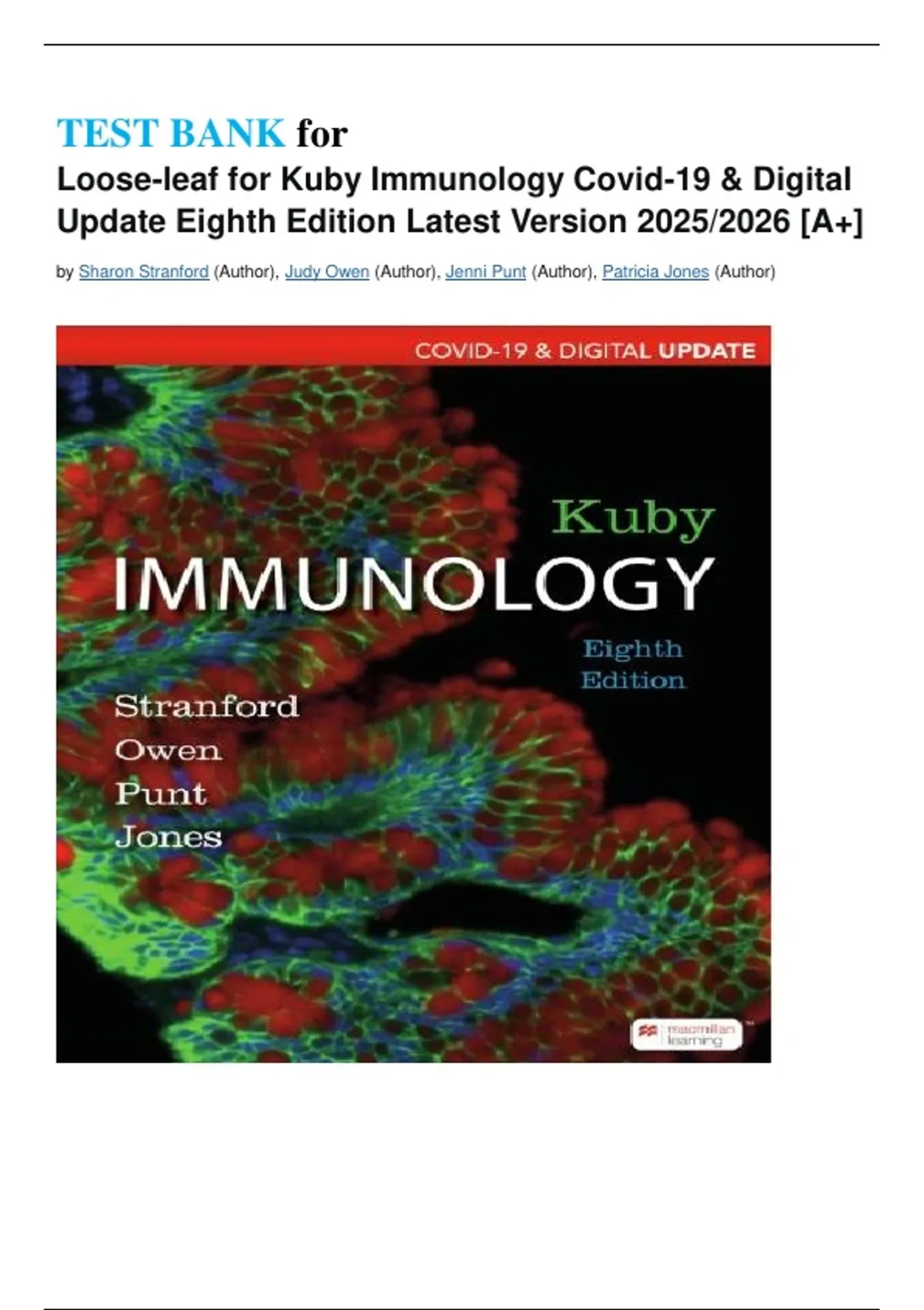 TEST BANK for Loose-leaf for Kuby Immunology Covid-19 & Digital Update Eighth Edition Latest Version 2025/2026 [A+] by Sharon Stranford (Author), Judy Owen (Author), Jenni Punt (Author), Patricia Jones (Author)
