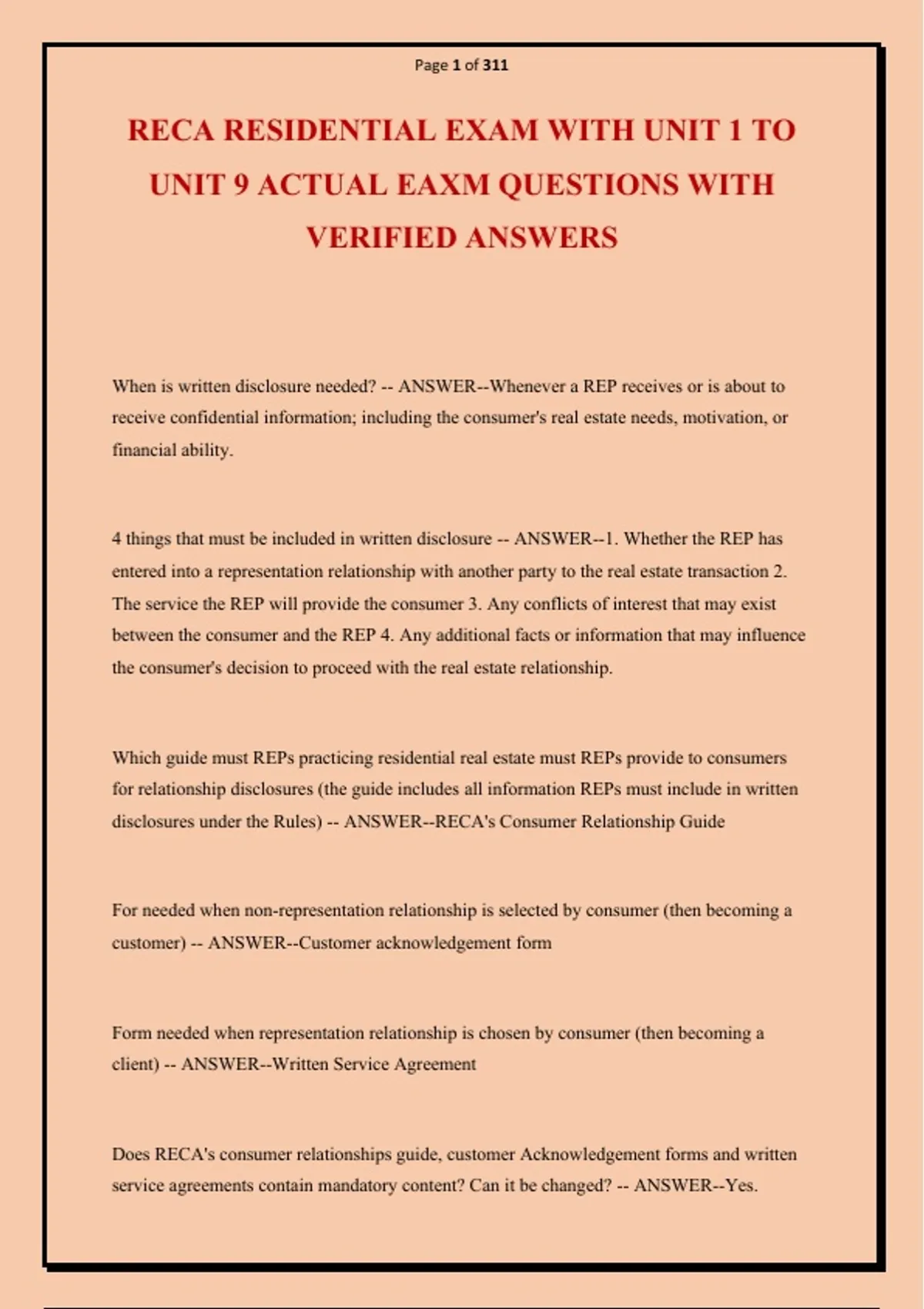 RECA RESIDENTIAL EXAM WITH UNIT 1 TO