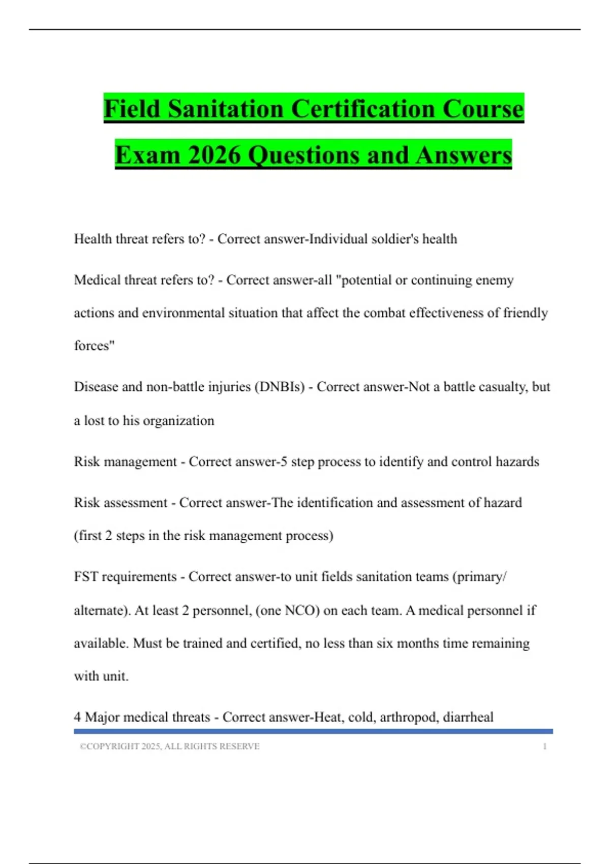 Field Sanitation Certification Course Exam 2026 Questions and Answers