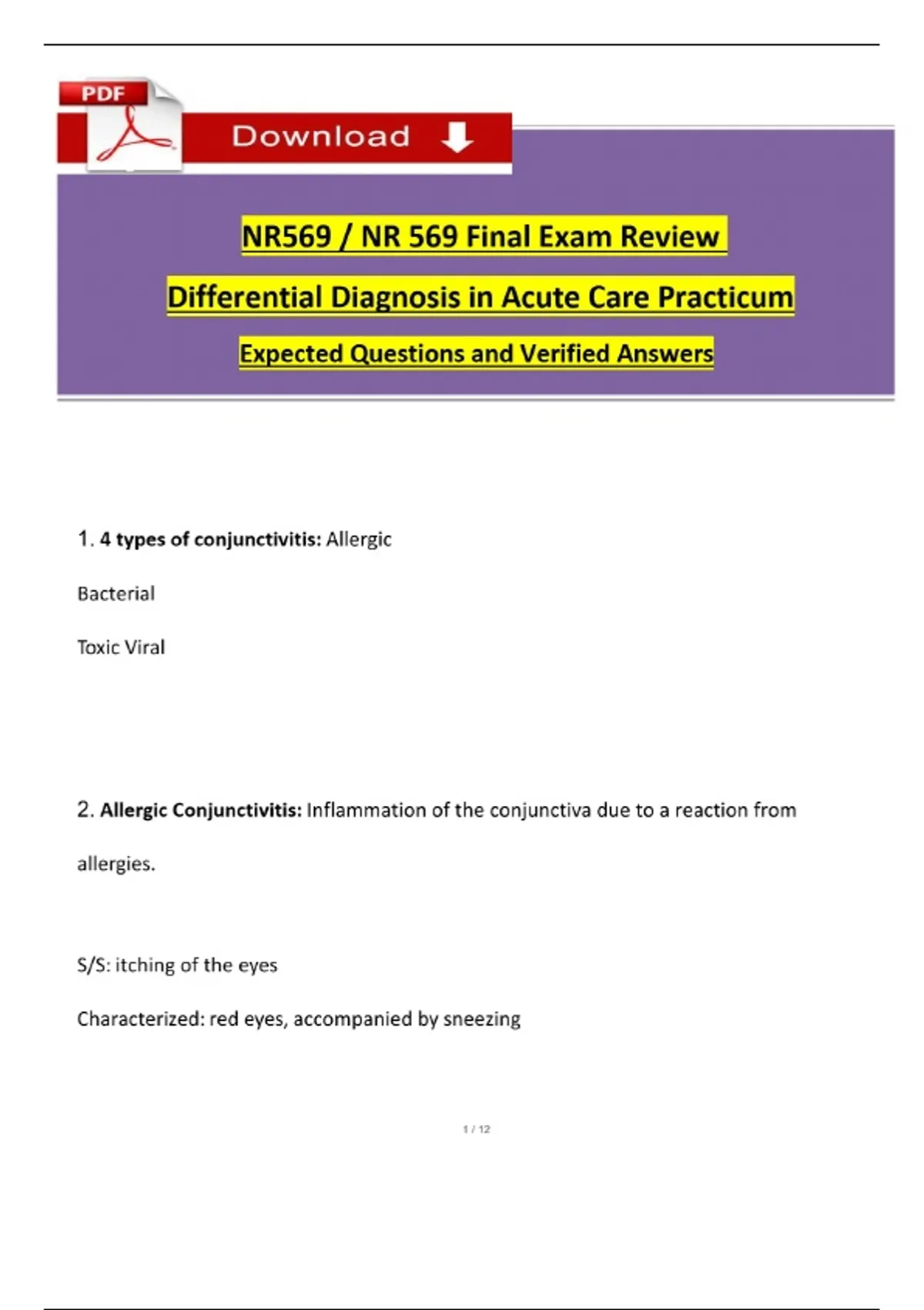 NR 569 Final Exam Study Guide: Differential Diagnosis in Acute Care (Conjunctivitis, Otitis, MSK) 2025