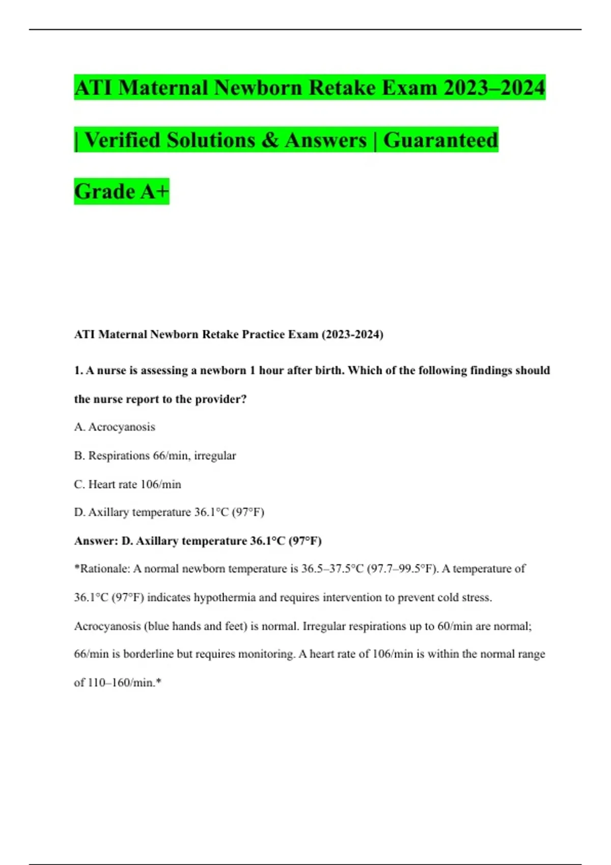 *Rationale: A normal newborn temperature is 36.5–37.5°C (97.7–99.5°F). A temperature of