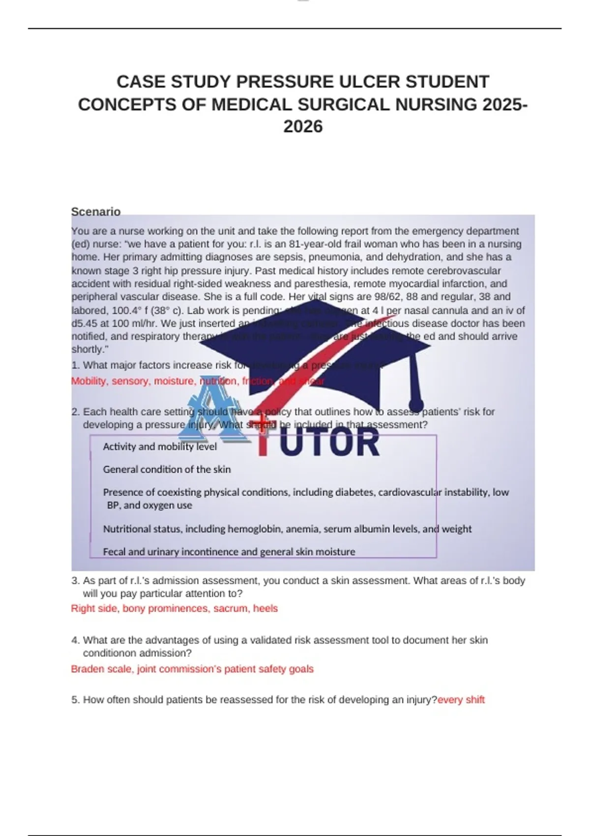 CASE STUDY PRESSURE ULCER STUDENT QUESTIONS ANSWERS