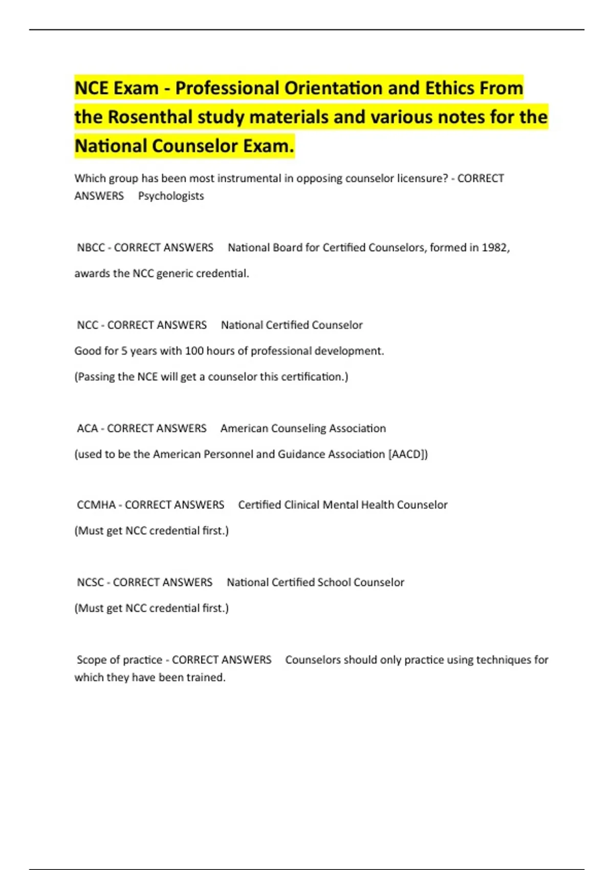 NCC - CORRECT ANSWERS Na onal Cer fied Counselor