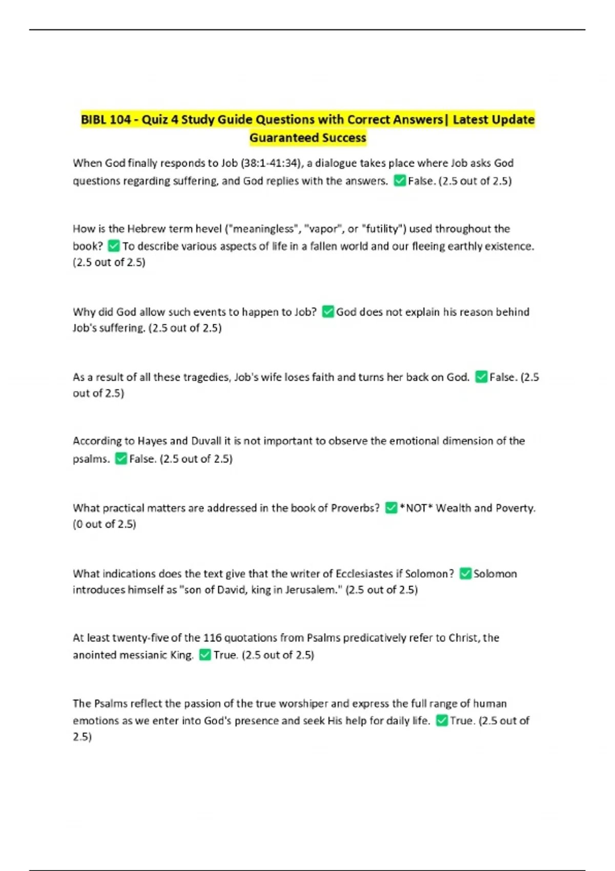 BIBL 104 - Quiz 4 Study Guide Questions with Correct Answers| Latest Update Guaranteed Success