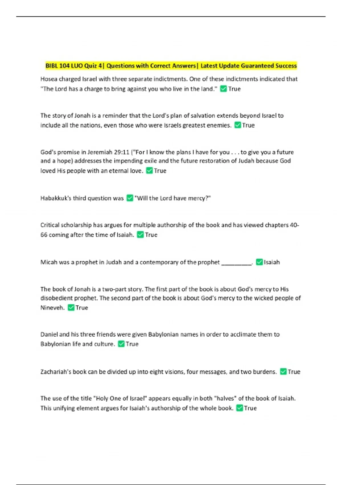 BIBL 104 LUO Quiz 4| Questions with Correct Answers| Latest Update Guaranteed Success