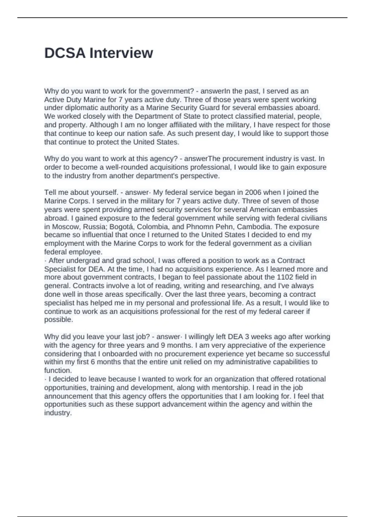 Why did you leave your last job? - answer· I willingly left DEA 3 weeks ago after working