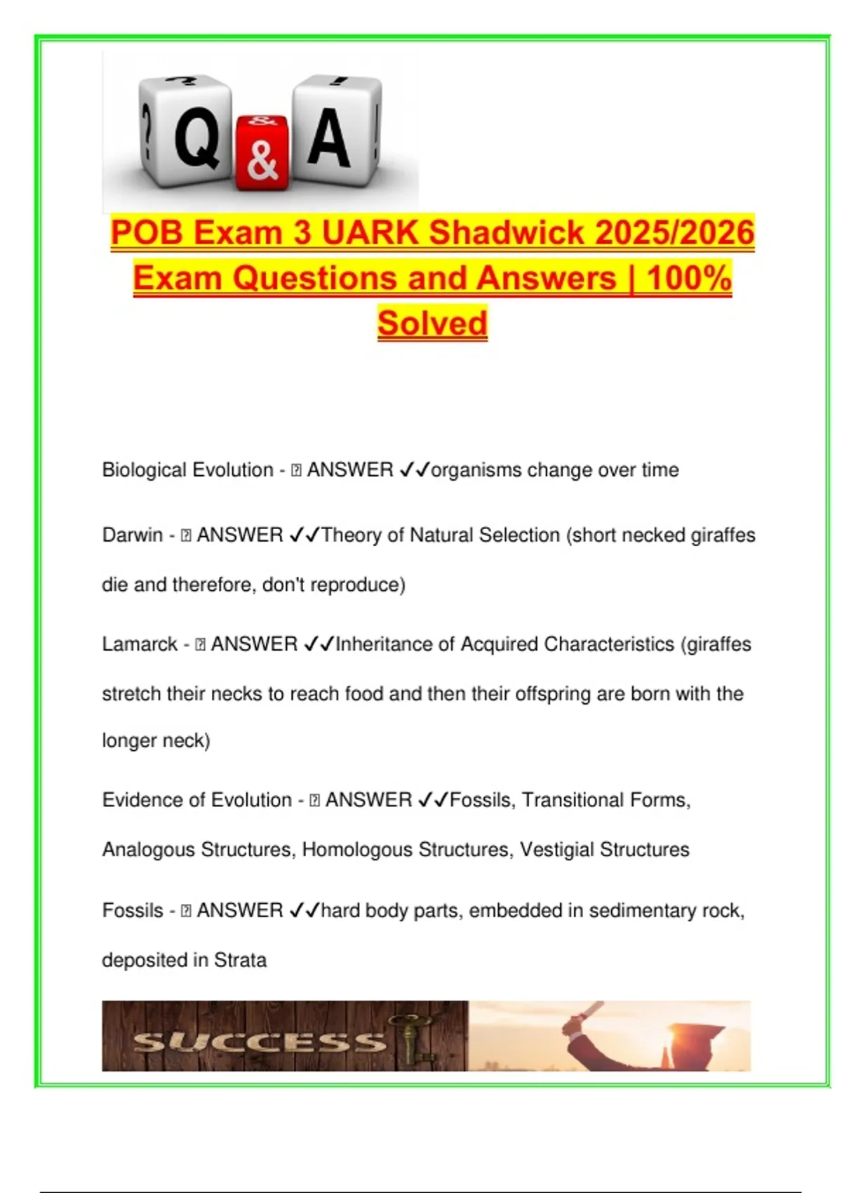 This document features over 100 fully answered and verified questions from Principles of Biology Exam 3 for Professor Shadwick’s course at the University of Arkansas (UARK), academic year 2025/2026. It provides a thorough and exam-focused review of core biological concepts essential for success in introductory college biology. The content is well-structured and ideal for undergraduate students enrolled in Principles of Biology, General Biology I/II, or preparing for pre-med, pre-vet, life sciences, or environmental science tracks. Each answer is clearly marked and accompanied by concise explanations for effective learning and retention. Major topics covered include: Biological Evolution: Darwin vs. Lamarck, natural selection types, microevolution vs. macroevolution, Hardy-Weinberg equilibrium Speciation & Reproductive Isolation: Allopatric, sympatric, pre-zygotic and post-zygotic barriers Prokaryotes & Archaea: Structure, reproduction, metabolism, gene transfer, Gram staining, types of archaea Bacteria: Pathogens, resistance, antibiotics, metabolism types, endospores Viruses: Structure, life cycle, antigenic drift/shift, prions Protists & Fungi: Evolution, types (sac fungi, club fungi), mutualistic relationships (lichens, mycorrhizae) Plant Biology: Algae to land plant evolution, mosses, ferns, gymnosperms, angiosperms, flower structures, pollination, and seed dispersal This document is ideal for: Biology majors and minors Pre-health and pre-veterinary students Students taking POB at UARK under Prof. Shadwick Anyone preparing for standardized biology exams (e.g., MCAT biology section) Learners needing a comprehensive and accessible exam review resource Whether used for last-minute studying or ongoing reinforcement, this guide ensures clarity and confidence in mastering biological systems and evolutionary mechanisms. Keywords: evolution, natural selection, speciation, Hardy-Weinberg, microevolution, macroevolution, bacteria, archaea, Gram stain, gene transfer, viruses, prions, protists, fungi, mycorrhizae, lichens, plant evolution, mosses, ferns, gymnosperms, angiosperms, flower anatomy, seed dispersal, POB Exam 3, University of Arkansas, UARK biology, Shadwick biology, biology exam prep