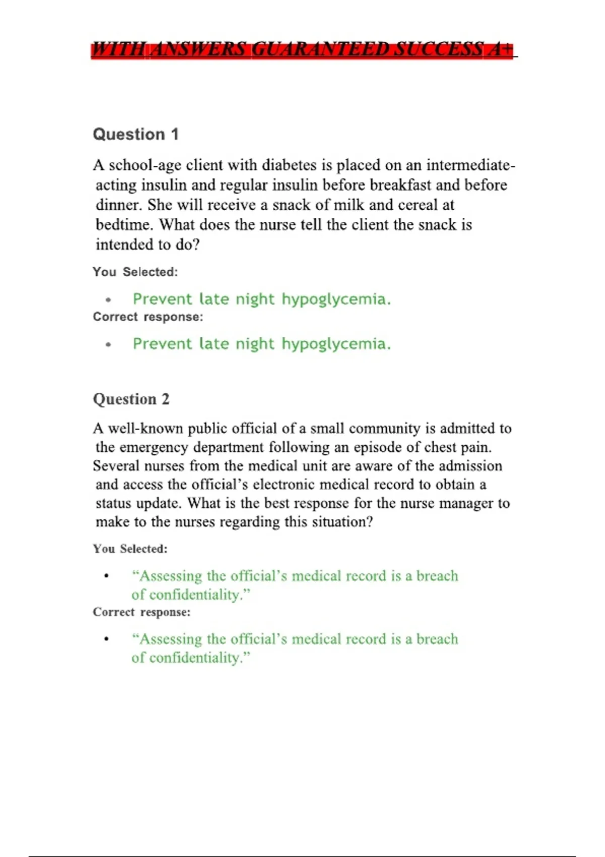 This comprehensive study guide is designed for nursing students and features a wide range of multiple-choice questions with verified answers. The content covers essential clinical topics such as diabetes management , leukemia interventions, patient confidentiality , and infection control. It also addresses key nursing concepts like safe medication administration , proper documentation , and effective communication with healthcare providers. This document aims to help users prepare for nursing exams and succeed in their coursework