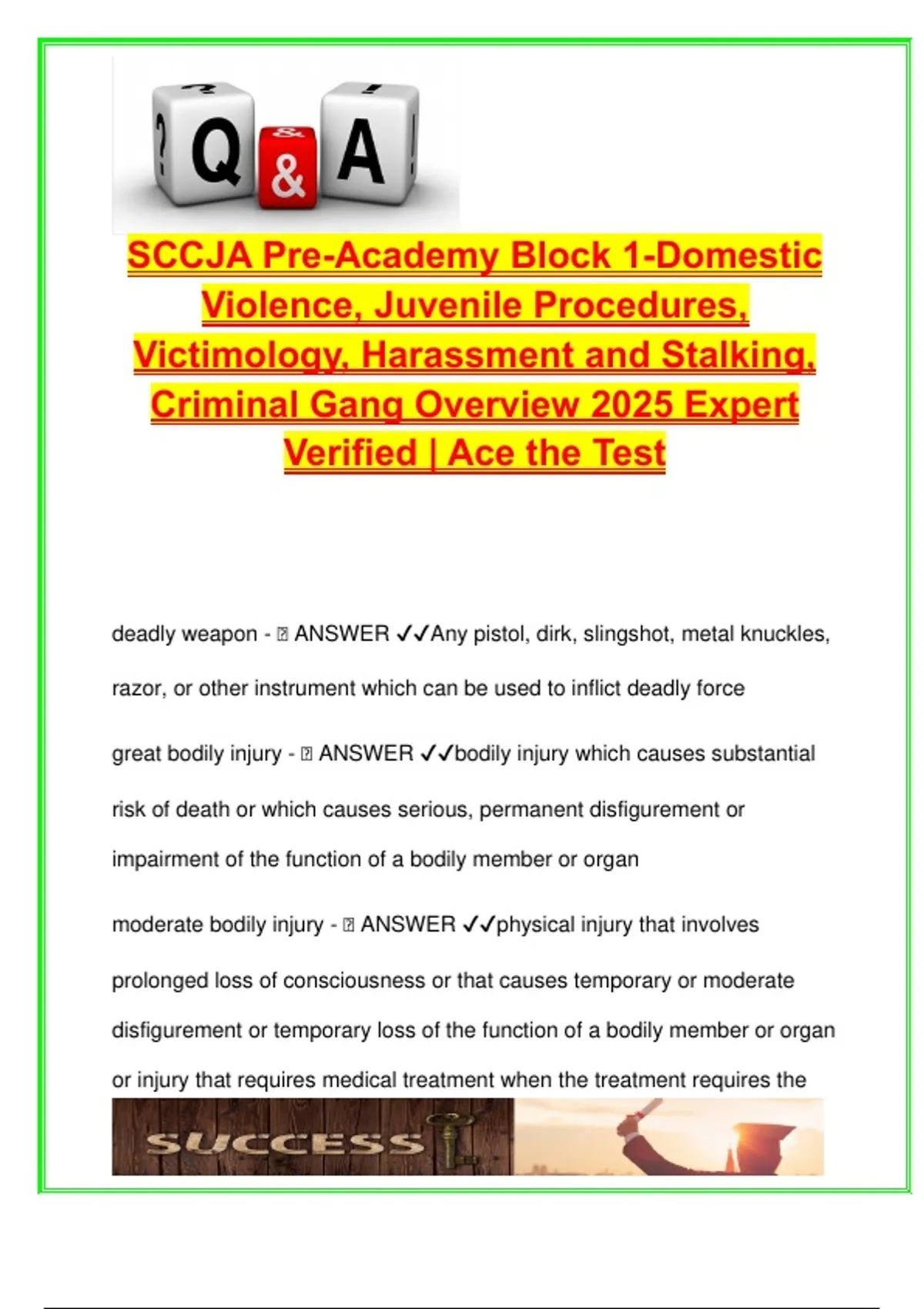 This expertly verified SCCJA Pre-Academy Block 1 study guide for the 2025/2026 academic year offers a complete and in-depth review of essential content areas for South Carolina law enforcement trainees. With over 100 solved Q&A items, the document is designed to reinforce critical foundational knowledge needed for success in both written assessments and real-world policing scenarios. Core content areas include: Domestic Violence (DV): Legal definitions, degrees of DV, related case law, officer responsibilities, scene protocol, primary aggressor factors, DV of a high and aggravated nature (DVHAN), protective orders, and victim communication strategies. Juvenile Procedures: Juvenile rights and legal standards (In re Gault, Kent v. US, McKeiver v. Pennsylvania), family court jurisdiction, DJJ processes, diversion programs, detention limits, and fingerprinting laws. Victimology: Victim rights, short and long-term trauma responses, interviewing techniques, support services (SCVAN, SOVA, SCCADVASA), cultural sensitivity, and trauma-informed policing. Harassment and Stalking: Legal definitions and thresholds for 1st/2nd-degree harassment, stalking behaviors, cyberstalking, protection orders, and indicators of victim danger. Criminal Gang Overview: SLED and VGTOF definitions, gang identifiers, gang types (traditional, hybrid, non-traditional), recruitment methods, historical street gangs, and LE gang response tactics. This resource is ideal for: South Carolina Criminal Justice Academy (SCCJA) cadets and instructors Law enforcement students, particularly those enrolled in basic training (BLE) Criminal justice majors, especially those pursuing careers in public safety, investigations, or victim advocacy Field training officers and pre-academy coaches looking for verified materials aligned with SCCJA learning objectives Included are real-world case law applications (Obergefell v. Hodges, State v. Abdullah), psychological indicators of deception, evidence admissibility rules, and communication do’s and don’ts at volatile scenes—all essential knowledge for emerging law enforcement professionals. Keywords: SCCJA, domestic violence law, juvenile procedures, victimology, harassment, stalking, criminal gang activity, South Carolina law enforcement, BLE prep, family court, In re Gault, DVHAN, restraining order, cyberstalking, SLED gang definition, law enforcement study guide, gang identifiers, protective orders, trauma-informed policing, SCVAN, SOVA, SC criminal justice