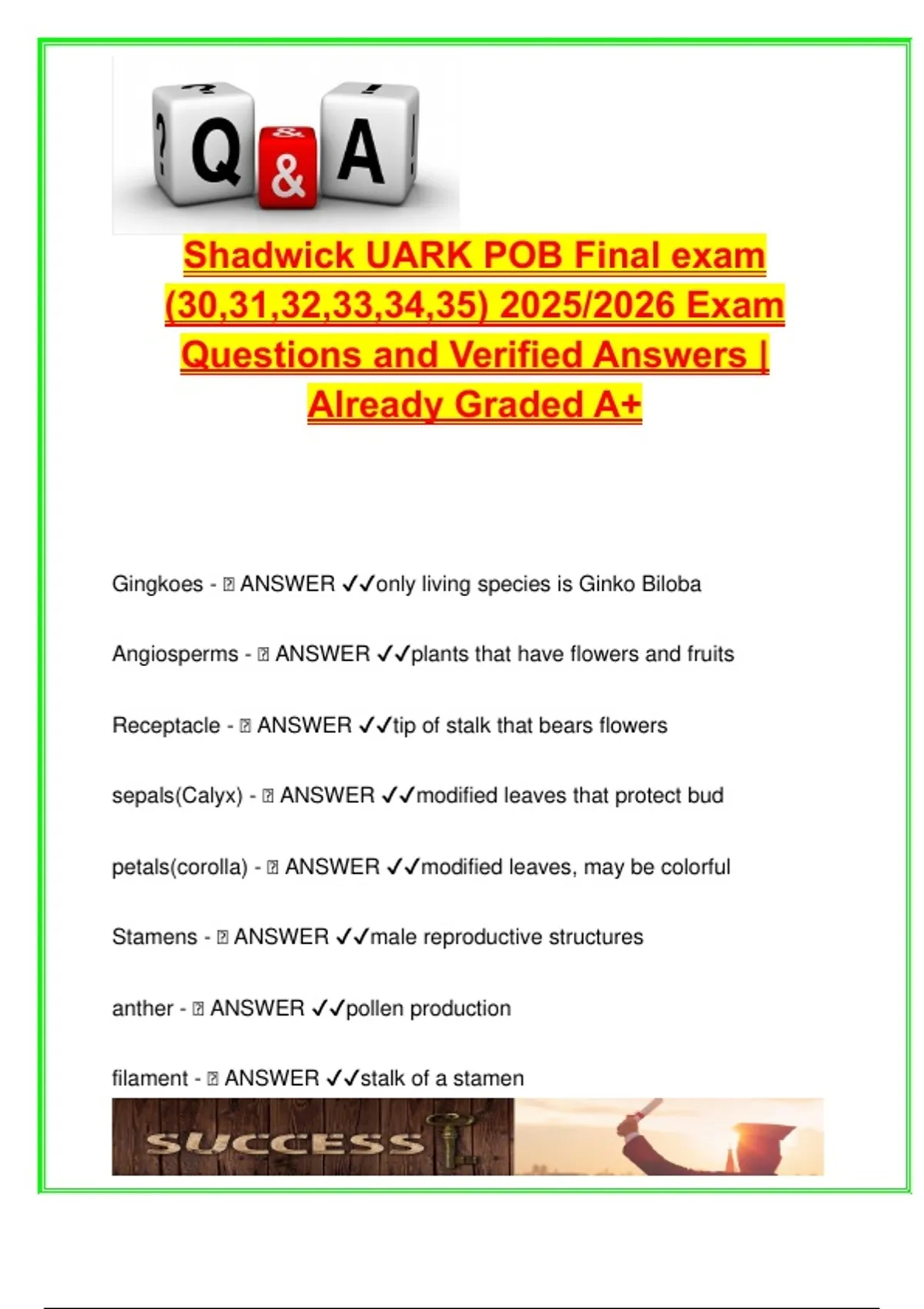 This POB (Principles of Biology) Final Exam Study Guide for the 2025/2026 academic year is a fully verified and A+-graded exam resource developed to support undergraduate biology students at the University of Arkansas and similar programs. It features 200+ exam-focused questions and answers covering every major topic from plant biology to evolutionary ecology—making it an essential tool for high-scoring final exam preparation. The guide offers detailed coverage of: Plant biology: Anatomy of flowers (stamens, carpels, petals, sepals), pollination and fertilization, life cycles (sporophyte and gametophyte), seed plant structures, gymnosperms and angiosperms, mosses, and ferns. Animal diversity and structure: Invertebrate and vertebrate characteristics, body symmetry, digestive systems, chordate evolution, flatworms, mollusks, annelids, arthropods, echinoderms, and all major phyla. Genetics and cellular biology: Reproduction (sexual and asexual), meiosis and mitosis, DNA, chromosomes, trait inheritance (dominant vs. recessive), and examples of gene-driven behavior (e.g., fosB gene). Human biology and physiology: Major body systems (nervous, circulatory, skeletal, muscular), homeostasis, and classifications of mammals (monotremes, marsupials, placental). Animal behavior and learning: Innate vs. learned behavior, imprinting, operant/classical conditioning, fixed action patterns, social structures, kin selection, sexual selection, and altruism. Ecology and environmental biology: Energy flow, biogeochemical cycles, types of survivorship, population dynamics, interspecies interactions (mutualism, parasitism, predation), and ecosystem structure. This guide is perfect for: University of Arkansas students in Principles of Biology courses Pre-med, pre-vet, zoology, botany, and life sciences majors Students preparing for final exams, quizzes, or lab practicals Anyone needing a broad, reliable biology refresher for standardized testing or academic review With clear, concise explanations, biological terminology, and accurate definitions, this study tool ensures high comprehension and retention, preparing students for both theoretical and applied exam questions. Keywords: biology exam guide, POB final exam, plant anatomy, animal phyla, invertebrates, vertebrates, mosses and ferns, meiosis and mitosis, genetic inheritance, behavioral ecology, operant conditioning, symbiosis, biogeochemical cycles, chordates, arthropods, University of Arkansas biology, plant reproduction, population dynamics, flower structure, ecology and evolution