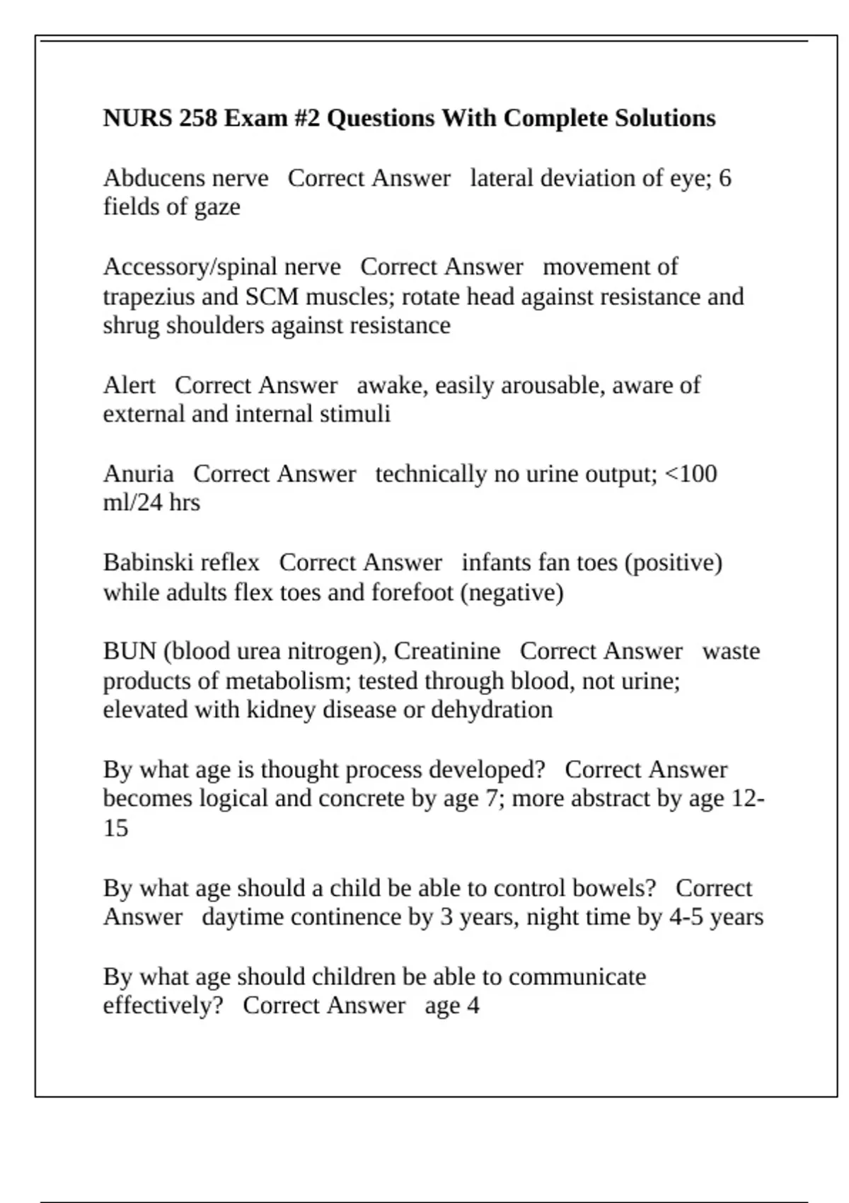 Babinski reflex Correct Answer infants fan toes (positive)