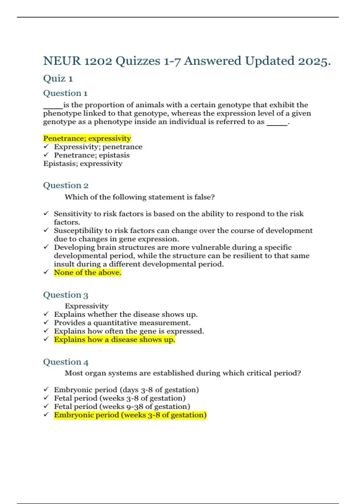 NEUR 1202 Quizzes 1-7 Answered Updated 2025. Quiz 1 Question 1 is the proportion of animals with a certain genotype that exhibit the phenotype linked to that genotype, whereas the expression level of a given genotype as a phenotype inside an individual is referred to as . Penetrance; expressivity  Expressivity; penetrance  Penetrance; epistasis Epistasis; expressivity Question 2 Which of the following statement is false?  Sensitivity to risk factors is based on the ability to respond to the risk factors.  Susceptibility to risk factors can change over the course of development due to changes in gene expression.  Developing brain structures are more vulnerable during a specific developmental period, while the structure can be resilient to that same insult during a different developmental period.  None of the above. Question 3 Expressivity  Explains whether the disease shows up.  Provides a quantitative measurement.  Explains how often the gene is expressed.  Explains how a disease shows up. Question 4 Most organ systems are established during which critical period?  Embryonic period (days 3-8 of gestation)  Fetal period (weeks 3-8 of gestation)  Fetal period (weeks 9-38 of gestation)  Embryonic period (weeks 3-8 of gestation) Question 5 The vulnerability of the developing brain is dependent on which of the following:  Whether an agent reaches the developing nervous system.  Period of exposure.  Whether an active metabolite reaches the developing nervous system.  All of the above Question 6 Phenotypical outcome is influenced by  Mutational load  Gene vulnerability  Penetrance  All of the above Question 7 Joanna and Darius both possess the gene that codes for dwarfism, however both of their characteristics differ quite a bit. Joanna has many health issues caused by her dwarfism and Darius has little to no issues with his health other than being shorter in stature. What phenomenon explains this?  Codominance  Multiple alleles  Penetrance  Variable expressivity Question 8 Most neurodevelopmental disorders can be described as monogenic in nature.  True  False Question 9 Which of the following condition is known to result from aneuploidy?  Fragile X Syndrome  Schizophrenia  Trisomy-21  Fetal Alcohol Syndrome Question 10 Your friend's child was recently diagnosed with an undisclosed genetic neurodevelopmental disorder (NDD). Your friend explains that there is no history of NDD in their family line. What could explain the sudden appearance of an NDD? ii) It is a concordant phenotype. jj) It is an autosomal dominant disorder. kk) There is a de novo mutation. ll) It is a discordant phenotype. Quiz 2 lec 4&5 Question 1 All environmental factors are teratogens. mm) True nn) False Question 2 Neurotoxicants that target the axon are known as axonopathies. a) True b) False Question 3 Based on the findings by Bellinger et al. (1987), there is a low correlation between umbilical cord lead blood level and mental development index score. c) True d) False Question 4 Maternal diabetic condition is a teratogen. oo) True pp) False Question 5 During pregnancy, hyperthermia can result in which of the following scenarios? qq) Using the hot tub rr) Performing low-intensity exercise ss)Infections tt) Two of the above Question 6 Which of the following factor(s) contribute to the levels of environmental toxicants in the blood and brain of babies and young children being many times higher than those found in adults? The difference in uu) Physiology vv) Diet ww) Behaviour xx) All of the above. Question 7 Which of the following description is correct? yy) Damage to the cerebellum can result in ataxia resulting in disturbances in gait. zz)Stereo anesthesia is the ability to recognize/understand an object by touch. aaa) Damage to the occipital lobe can result in hardness of hearing. bbb) Damage to the postcentral gyrus can result in muscle weakness and muscle cramp. . Question 8 Critical period is ccc) A flexible time-window during which the development of an organism is resistant to change. ddd) A restricted time-window during which the development of an organism is most prone to change. eee) A flexible time-window during which the development of an organism is most prone to change. fff)A restricted time-window during which the development of an organism is resistant to change. Question 9 From a mechanistic perspective, botulinum toxin would fall under which of the following categories? ggg) Affect neurotransmission hhh) Axonopathies iii) Myelinopathies jjj) Neuronopathies Question 10 Genetic factors operate in the context of environmental conditions. This statement is supported by which of the following: kkk) Environmental factors being risk modifiers. lll) Environmental factors being modifiable risk factors. mmm) All of the above. nnn) None of the above. Quiz 3 lec 6 &7 Question 1 PON1 (paraoxonase 1) is a key enzyme in the metabolism of organophosphate pesticides, therefore ooo) Children of mothers with high PON1 levels are selectively vulnerable to the adverse effects of OPs. ppp) Children of mothers with low PON1 levels are the least vulnerable to the adverse effects of OPs. qqq) Children of mothers with high PON1 levels are more vulnerable to the adverse effects of OPs. rrr) Children of mothers with low PON1 levels are more vulnerable to the adverse effects of OPs. Question 2 Due to the advancement of technology, screening and diagnostic tests are 100% accurate. sss) True ttt) False Question 3 Karyotyping provides the following information to allow for the identification of chromosomal deficits. uuu) Size of the chromosome vvv) Shape of the chromosome www)Number of chromosomes xxx) All of the above Question 4 Nuchal translucency is a type of diagnostic test, that helps physicians determine if the baby is statistically more likely to have a chromosome abnormality. yyy) True zzz) False Question 5 PUBS is performed by aaaa) T