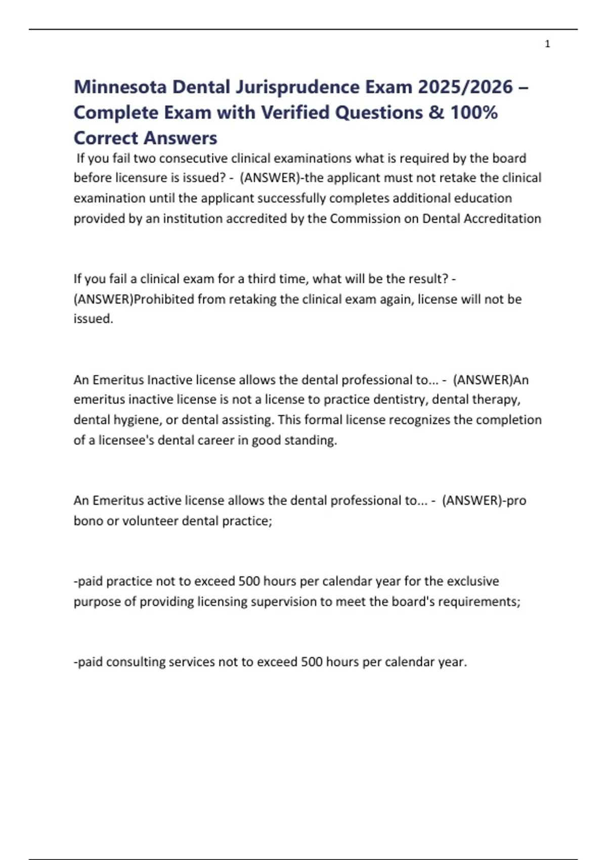 Minnesota Dental Jurisprudence Exam 2025/2026 – Complete Exam with Verified Questions & 100% Correct Answers