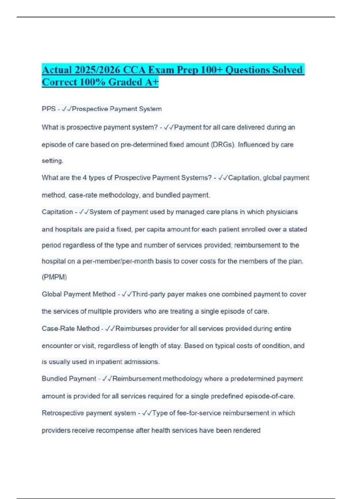 Actual 2025/2026 CCA Exam Prep 100+ Questions Solved Correct 100% Graded A+ PPS - Prospective Payment System What is prospective payment system? - Payment for all care delivered during an episode of care based on pre-determined fixed amount (DRGs). Influenced by care setting. What are the 4 types of Prospective Payment Systems? - Capitation, global payment method, case-rate methodology, and bundled payment. Capitation - System of payment used by managed care plans in which physicians and hospitals are paid a fixed, per capita amount for each patient enrolled over a stated period regardless of the type and number of services provided; reimbursement to the hospital on a per-member/per-month basis to cover costs for the members of the plan. (PMPM) Global Payment Method - Third-party payer makes one combined payment to cover the services of multiple providers who are treating a single episode of care. Case-Rate Method - Reimburses provider for all services provided during entire