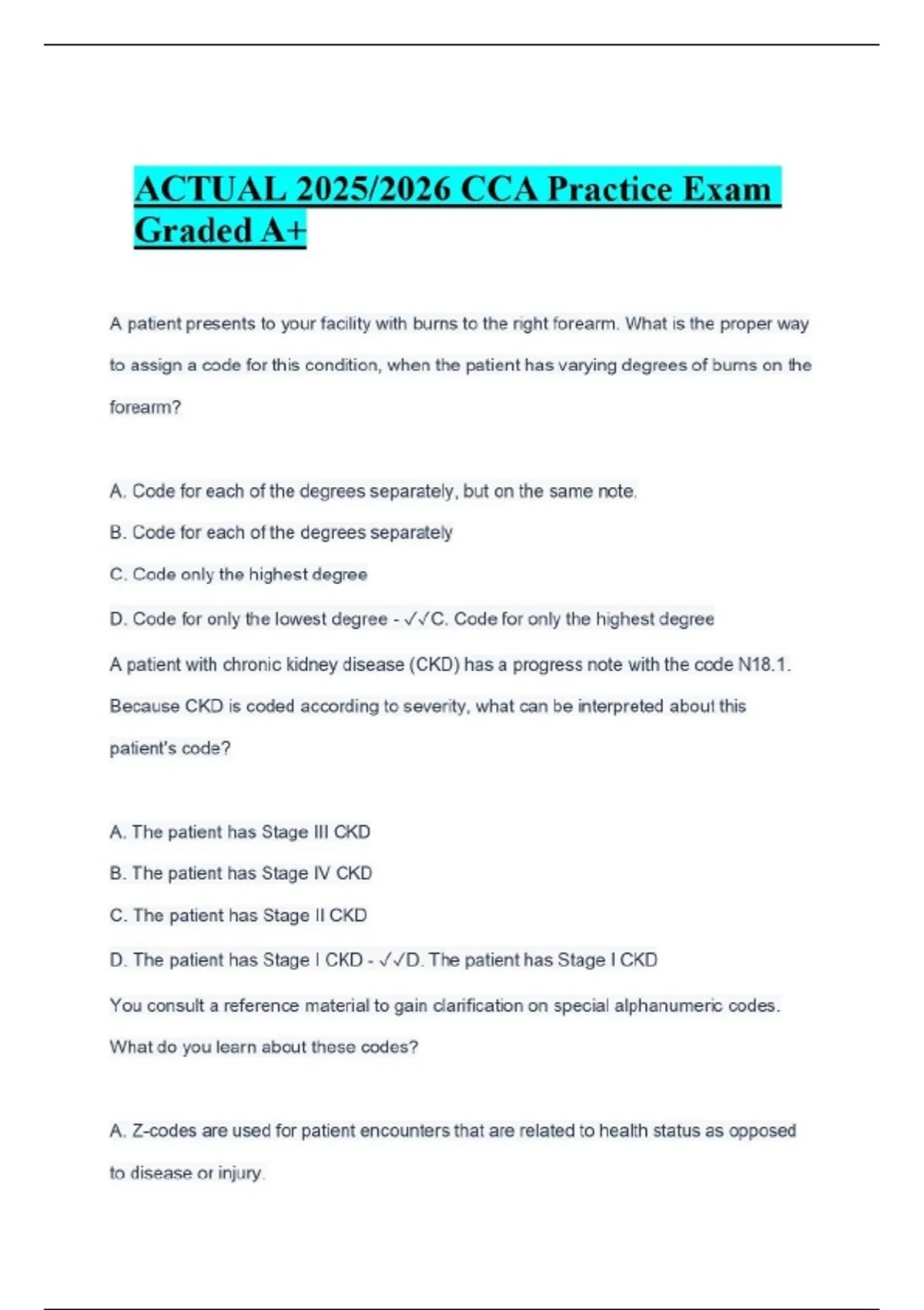 ACTUAL 2025/2026 CCA Practice Exam Graded A+ A patient presents to your facility with burns to the right forearm. What is the proper way to assign a code for this condition, when the patient has varying degrees of burns on the forearm? A. Code for each of the degrees separately, but on the same note. B. Code for each of the degrees separately C. Code only the highest degree D. Code for only the lowest degree - C. Code for only the highest degree A patient with chronic kidney disease (CKD) has a progress note with the code N18.1. Because CKD is coded according to severity, what can be interpreted about this patient's code? A. The patient has Stage III CKD B. The patient has Stage IV CKD C. The patient has Stage II CKD D. The patient has Stage I CKD - D. The patient has Stage I CKD You consult a reference material to gain clarification on special alphanumeric codes. What do you learn about these codes?