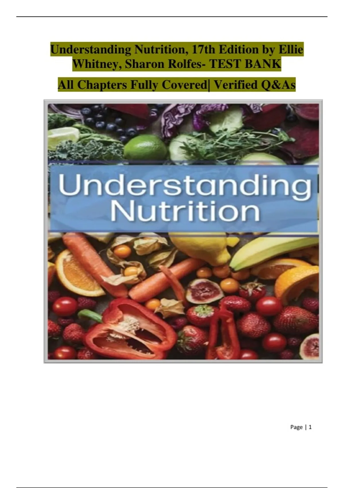 This document contains the complete verified test bank for Understanding Nutrition, 17th Edition by Ellie Whitney and Sharon Rolfes. It includes multiple-choice questions, matching, completion, and essay-style questions with detailed answers, covering all chapters and highlights from the textbook. Topics span from basic nutrition concepts, diet planning, digestion, energy balance, and macronutrients to vitamins, minerals, lifecycle nutrition, and global food concerns. This resource is ideal for exam preparation and in-depth review of the course material.