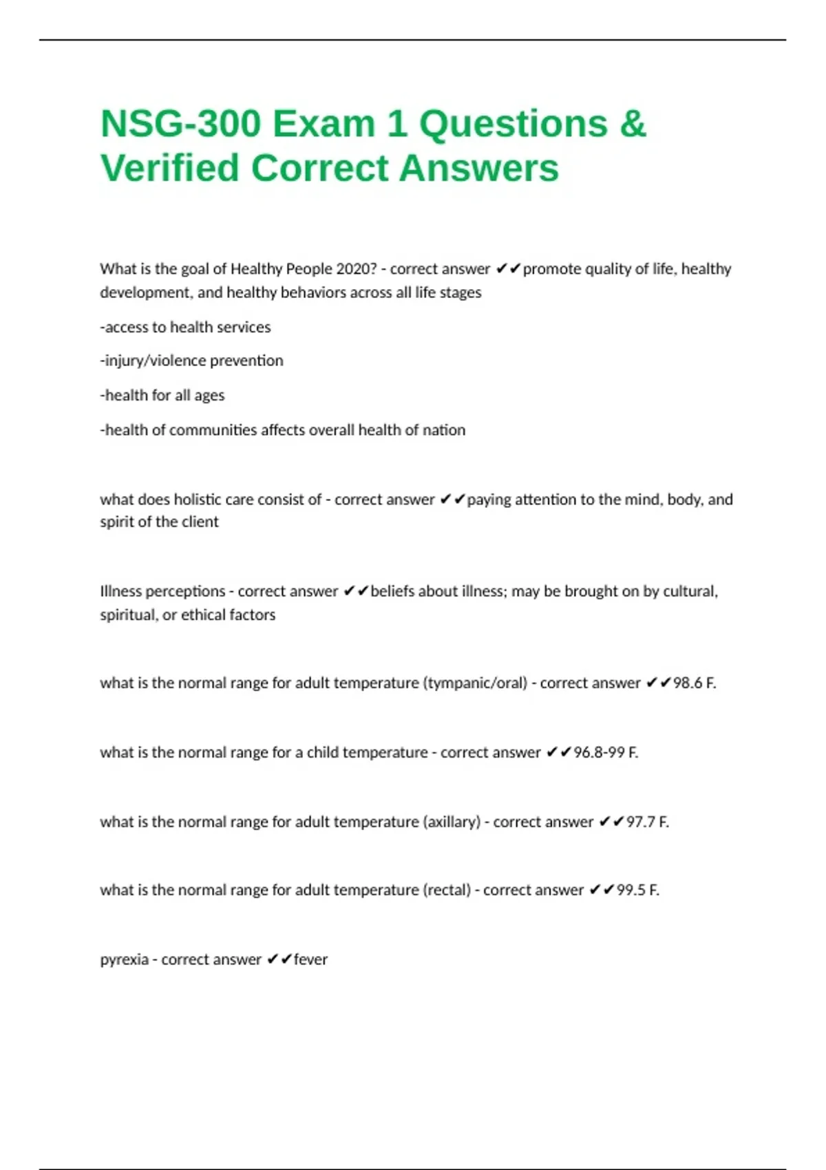 NSG-300 Exam 1 Questions & Verified Correct Answers Students will study how to assess community health needs, monitor health status, and apply environmental, social, and policy interventions to improve overall public health. Topics include core public health functions, environmental health, health promotion, disease prevention, and addressing social determinants of health and access to health care services.