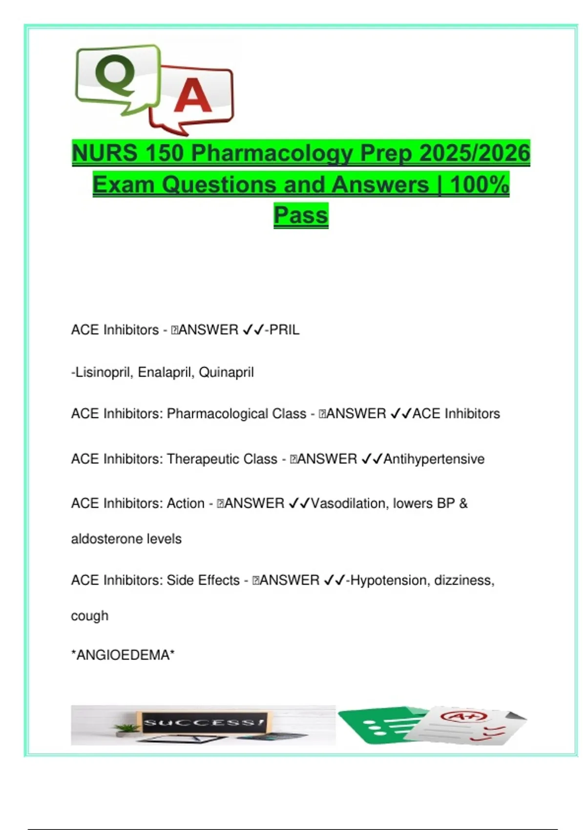 ACE Inhibitors: Pharmacological Class - 🧠ANSWER ✔✔ACE Inhibitors