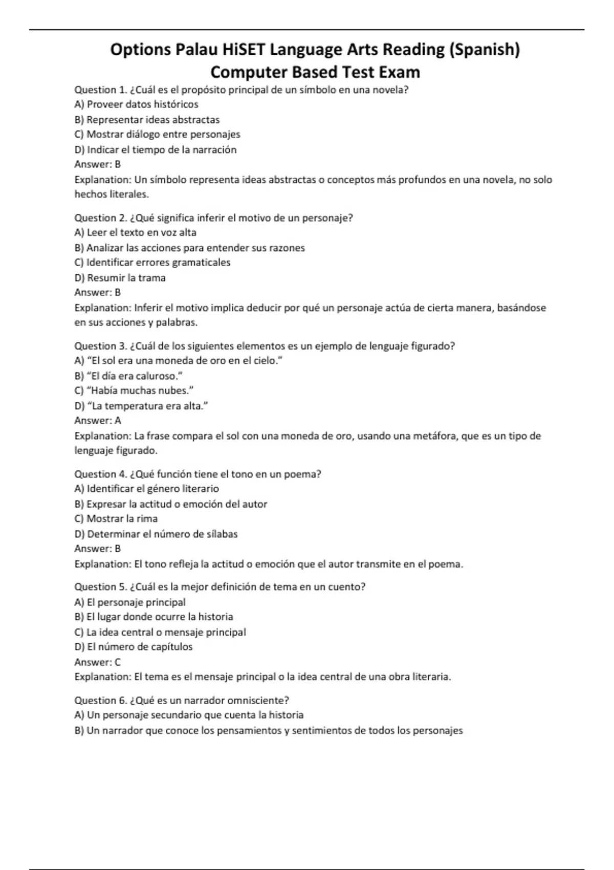 Options Palau HiSET Language Arts Reading (Spanish) Computer Based Test Exam