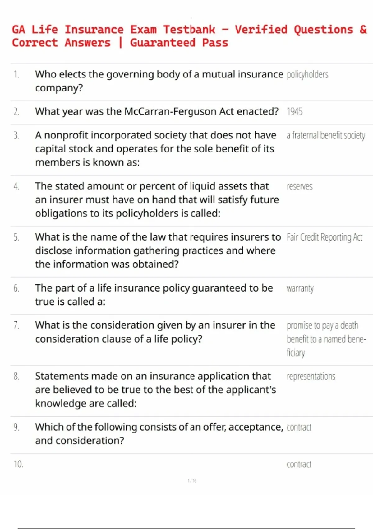 The Georgia Life Insurance Exam Test Bank – Verified Practice Questions & Correct Answers (2025 Update) is a complete study resource for candidates preparing for the Georgia life insurance licensing exam. This guide includes realistic practice questions with verified correct answers, making it a reliable tool for mastering exam concepts and boosting confidence. It covers essential topics tested on the Georgia Life Insurance Exam, including insurance regulations, policy provisions, underwriting, types of life insurance policies, annuities, and ethical practices. Each question is designed to reflect the actual exam format and ensure you are fully prepared.