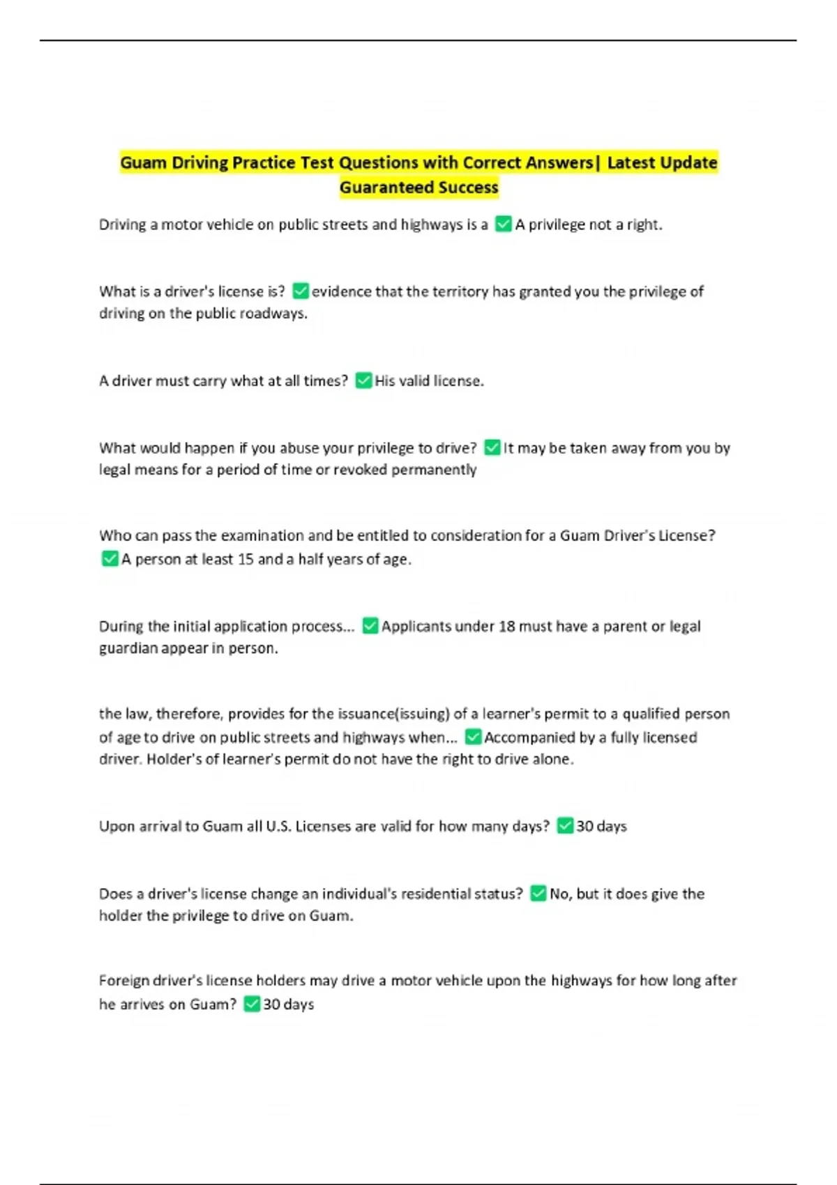 Guam Driving Practice Test Questions with Correct Answers| Latest Update Guaranteed Success
