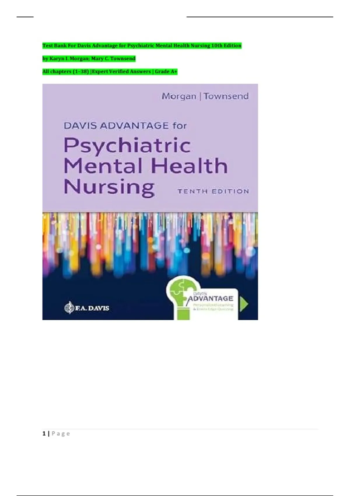 This document provides the full test bank for Davis Advantage for Psychiatric Mental Health Nursing, 10th Edition by Karyn I. Morgan and Mary C. Townsend. It contains expert-verified questions and answers for all 38 chapters, covering psychiatric disorders, nursing interventions, therapeutic communication, psychopharmacology, and mental health care strategies. The content is designed for exam preparation and offers Grade A+ quality answers to support nursing students and educators.