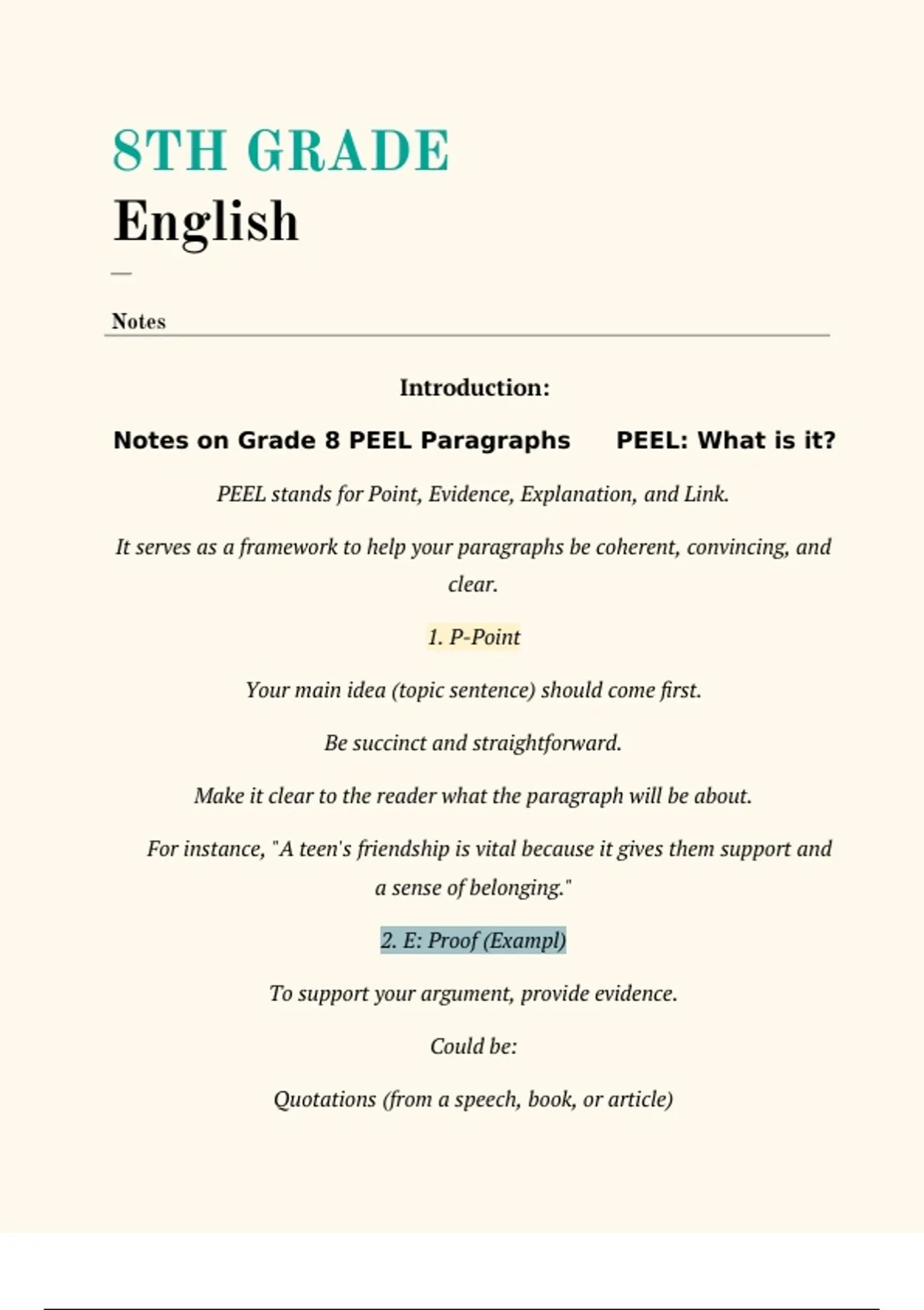 Notes on Grade 8 PEEL Paragraphs ✨ PEEL: What is it?